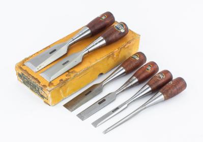 B67-461 BEVEL EDGE CHISELS. Stanley No. 50 IOB. Box says it contains six 1-1/2" size chisels, but actually contains six different width No. 50s that appear to be a set; 1-1/2" to 1/4" widths; all with sweetheart marks. Wrapped in what looks like original waxed paper (not pictured). Decals on handles mostly worn off but overall clean and sharp and wood is good. Box has overall wear, Type 6B label is 60%. Good+ 200-400