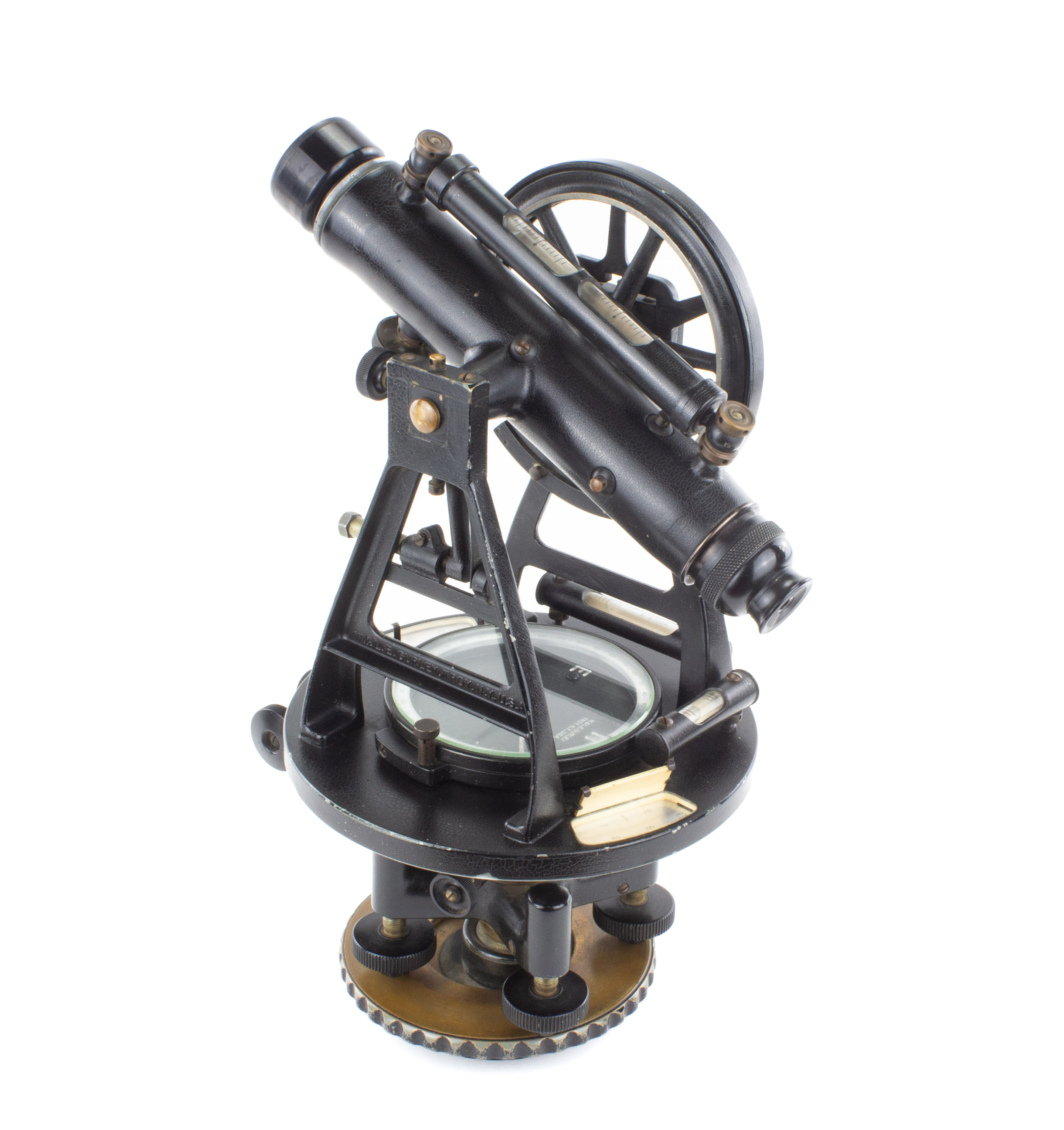 B67-475 ENGINEER'S TRANSIT. W. & L.E. Gurley. Serial No. 471234 which dates it to 1947. Black lacquered brass. 3-1/2" needle, 8" scope with striding level, full vertical circle. Good optics, works smoothly, four point base. In original box with metal labels, clean and complete. Good+ 150-300
