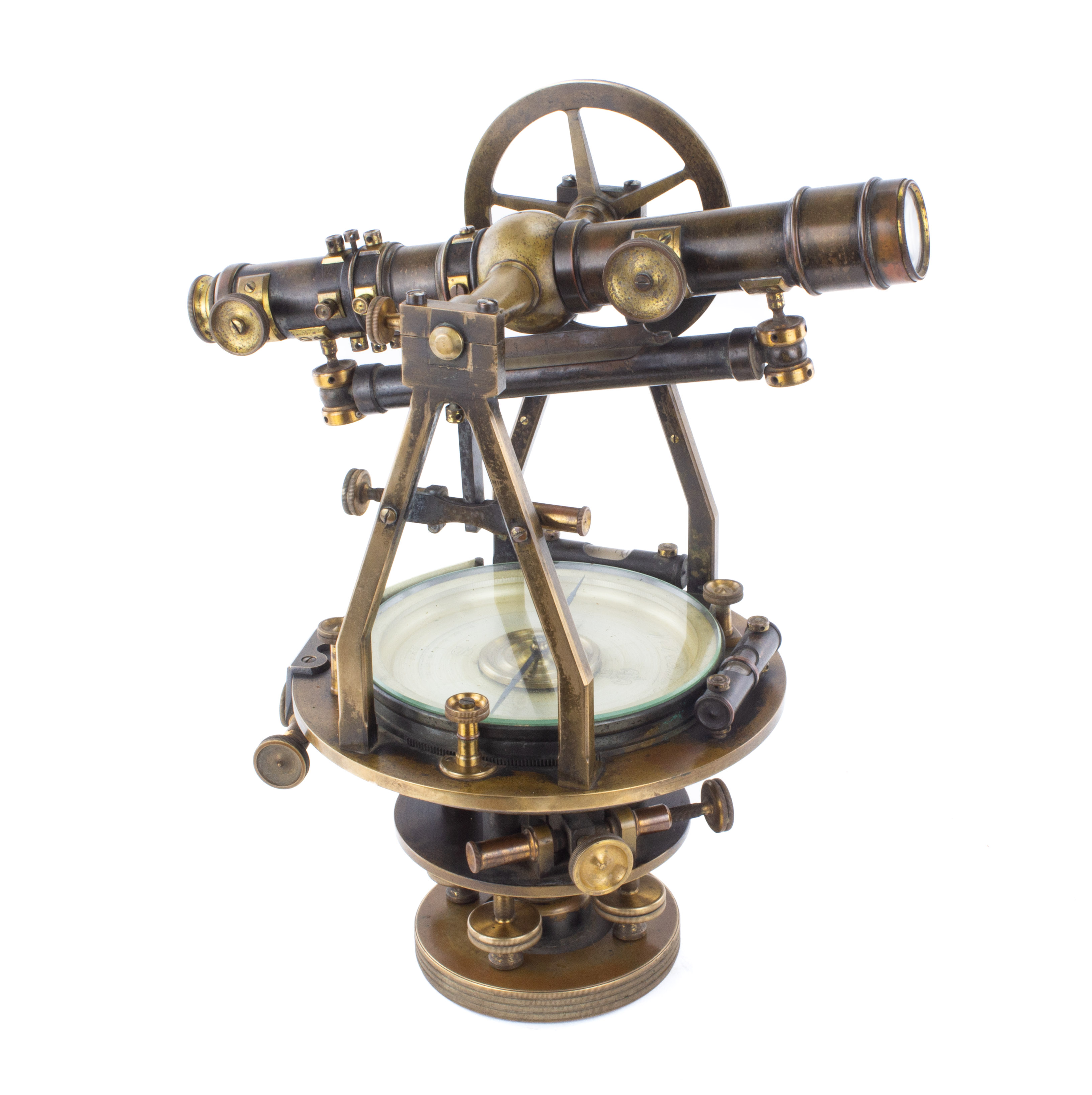 B67-477 ENGINEER'S TRANSIT. W. & L.E. Gurley. Probably dates to late 1880s, all brass, 5" needle, 11-1/2" scope with hanging level, full vertical circle with opposed tangent screws, four point base. Brass is unpolished, good optics, works smoothly. In original box with label in lid, worn and cracked with no straps, includes plumb bob. From the collection of Harold Unruh. Good+ 250-500