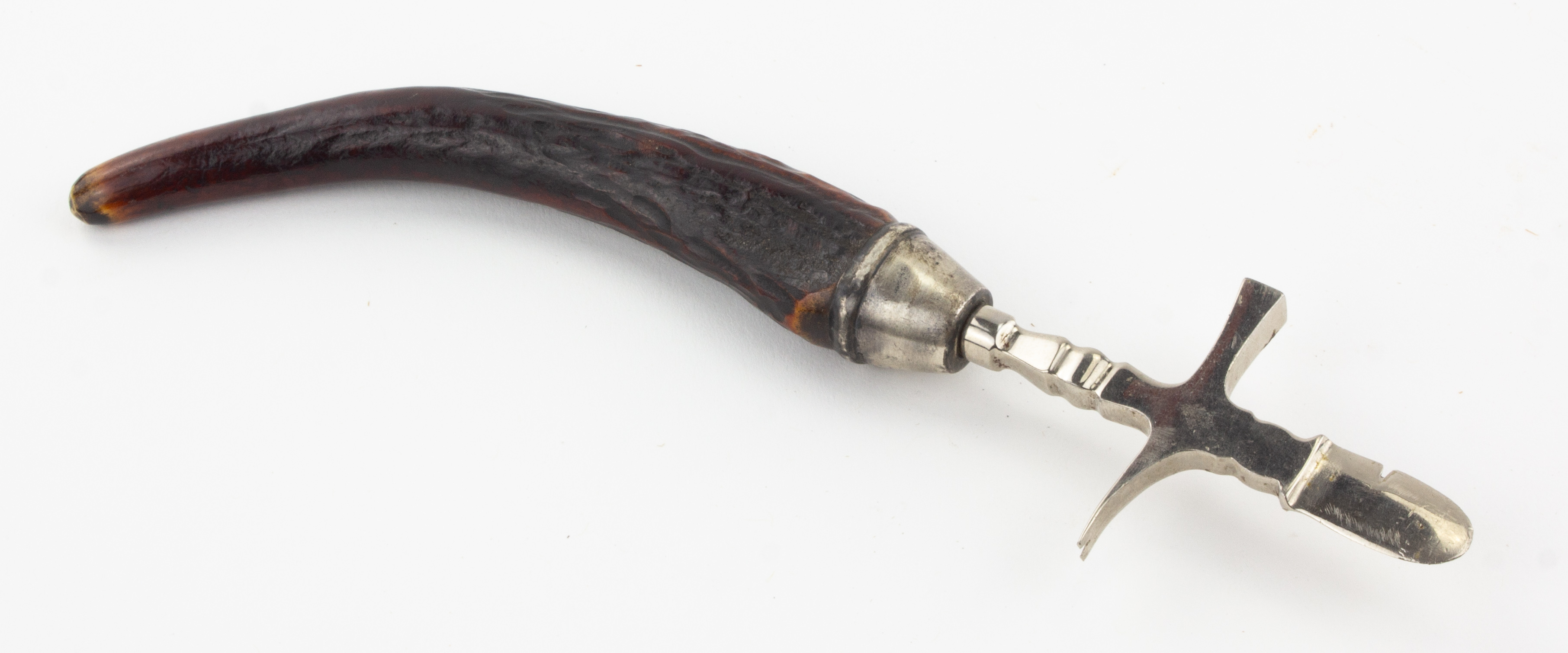 B67-480 COMBINATION LETTER OPENER. Nickel plated letter opener with hammer and tack puller cast below the opener. 8-1/2" overall with 5" curved bone handle. Unsigned, in near mint condition. From the collection of David Jeffers. Fine 60-120