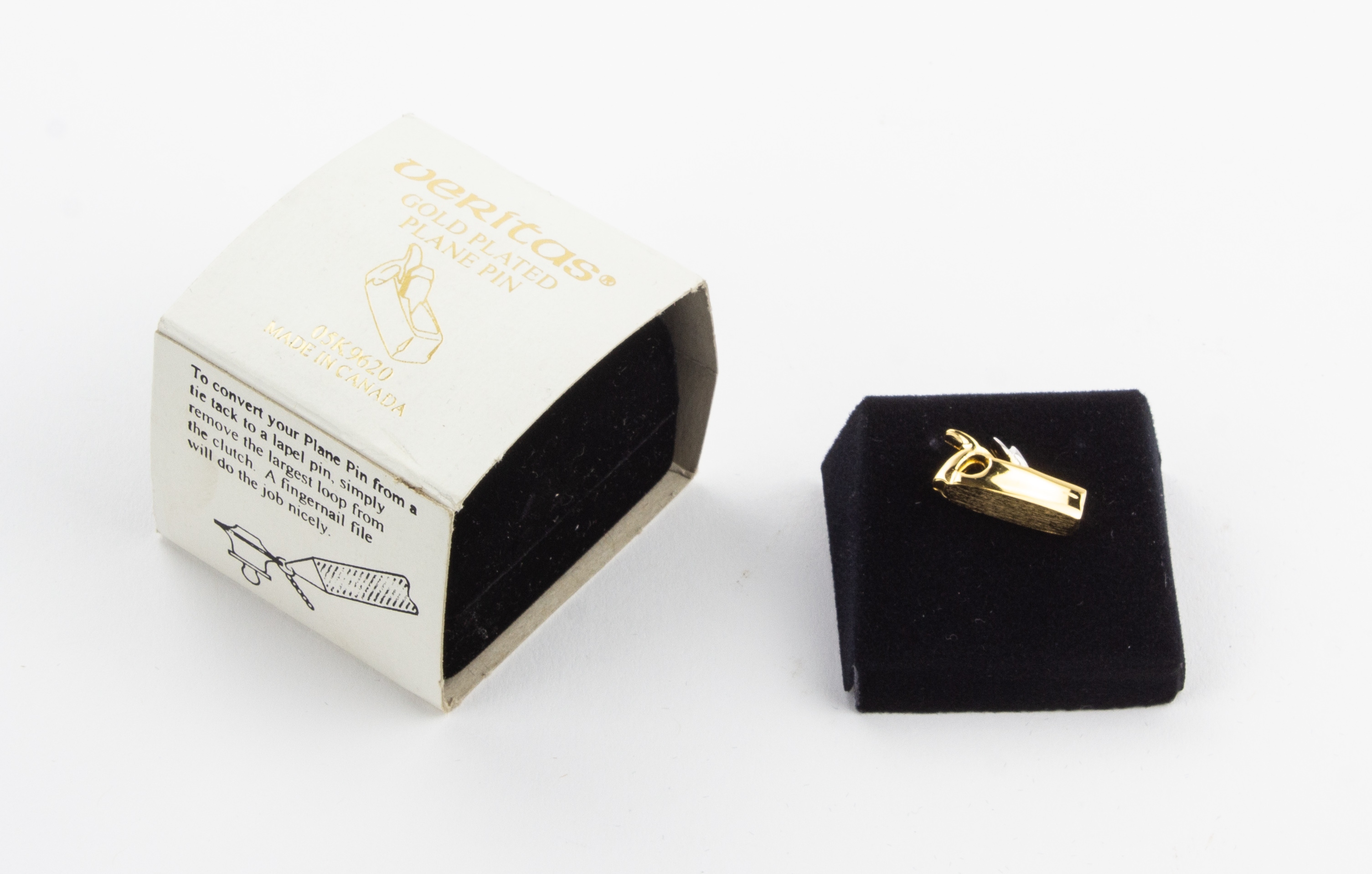 B67-487 ADVERTISING. Veritas Gold Plated Tie Tack. 3/4" long in the shape of a wood bodied smoothing plane. Since hardly anyone wears tie tacks any more, the instructions helpfully show you how to use it as a lapel pin. Mint in its original packaging. Fine 50-100