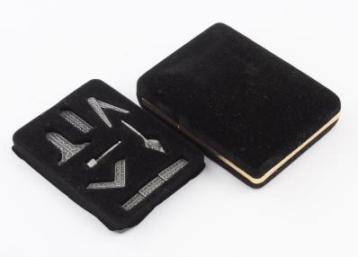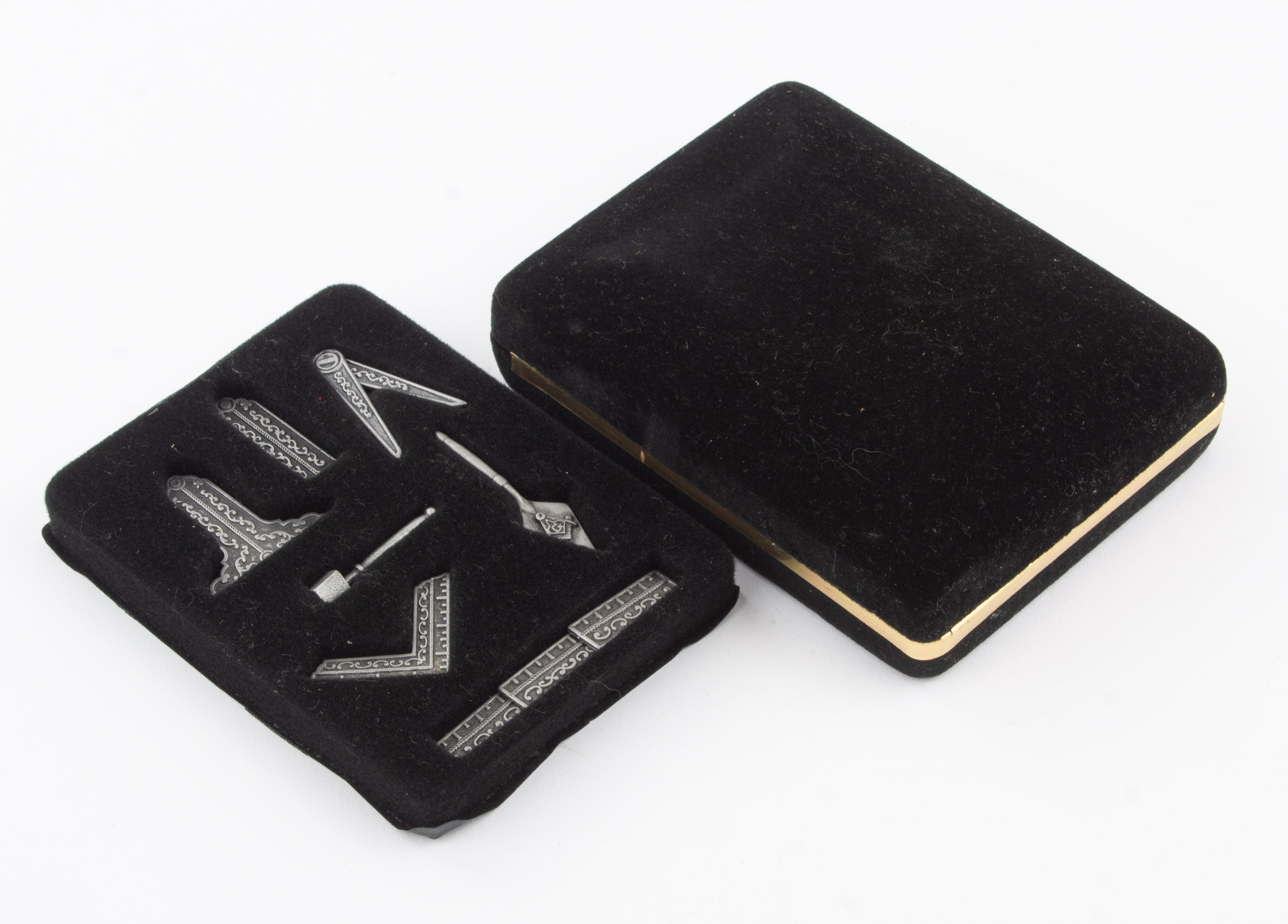 B67-488 SET OF MINIATURE MASON'S TOOLS. Trowel with mason's symbol, two plumb boards, square, mallet, calipers and folding rule. The two plumb boards don't have working bobs, but the calipers and folding rule work. Appear to be pewter and around 1.5" long, unsigned but beautifully made in original fitted clamshell box. Fine 100-200