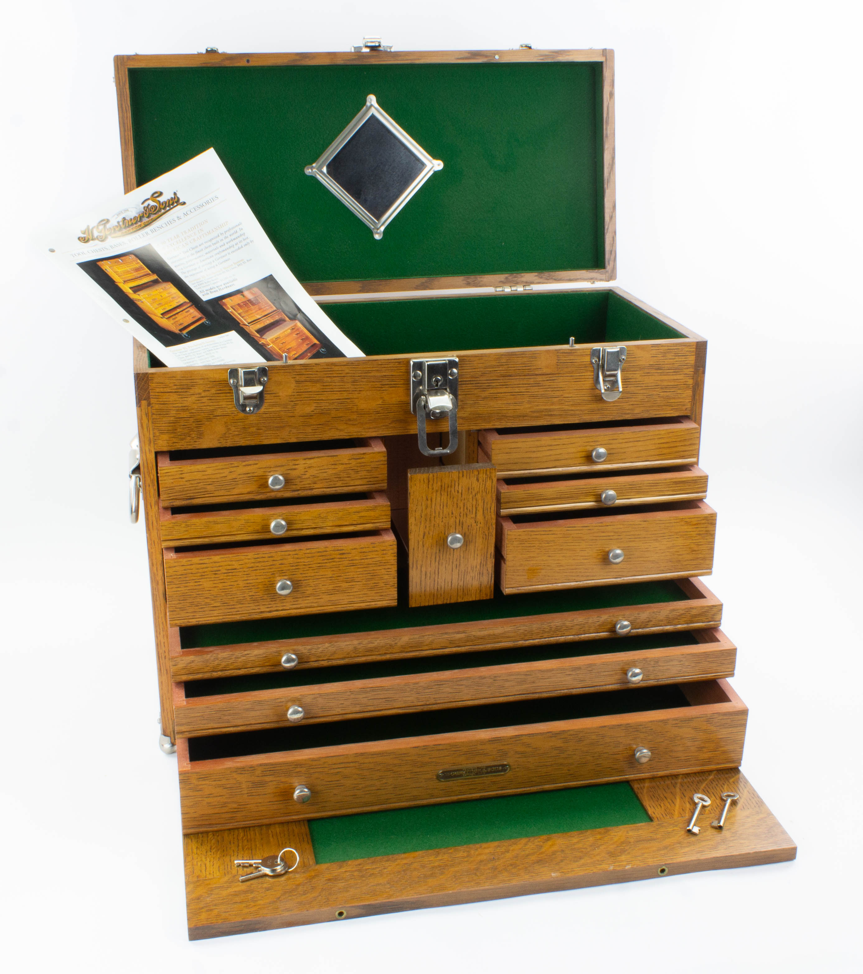 B67-489 MACHINIST CHEST. Gerstner. Oak chest, 9-1/2" x 20" x 16", with nine drawers plus central compartment and top compartment, felt lining immaculate, looks new and unused. Includes original keys to lock and copy of the Gerstner catalog from 1989. From the collection of Bill Webber. Fine 300-600