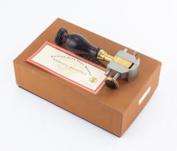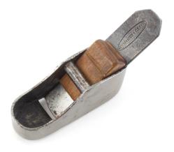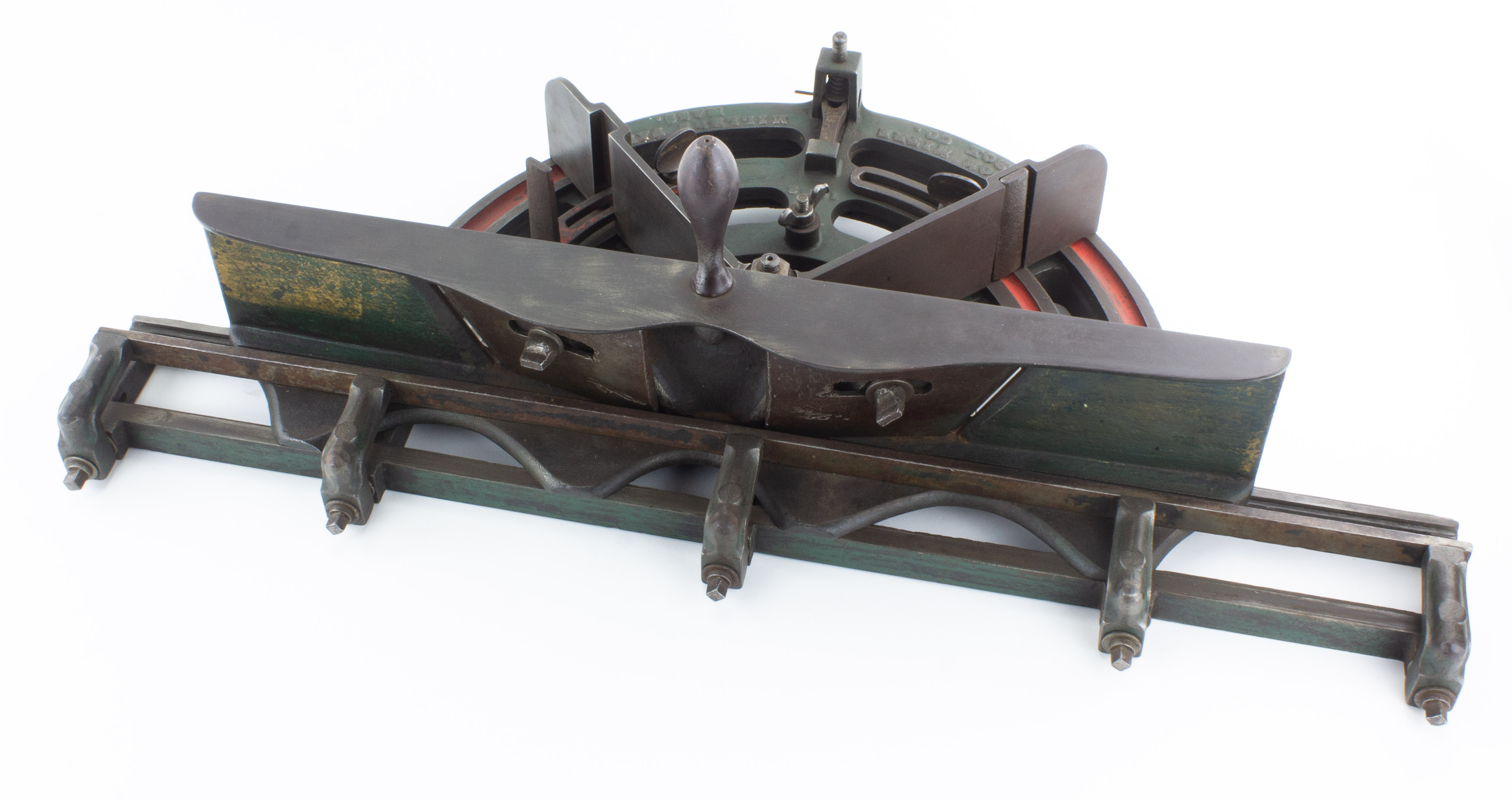 B67-491 MITRE PLANER. Millers Falls. Patented in 1882 by David Rogers of Greenfield, MA, and marketed first by Langdon Bros. and then by MF after it acquired Langdon, this beast is generally regarded as the best combination shooting board and miter cutter ever made. Its bulk makes it very stable, the double-cutter plane cuts in either direction, and the swinging fence can either be used at preset angles or adjusted for individual angles. This is the middle size, with 3-1/2" wide skewed cutters. All correct parts, original red paint about 60%, overall clean with only a few rust spots. From the collection of Harold Unruh. Good+ 1000-2000