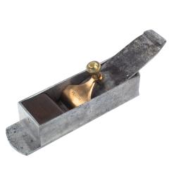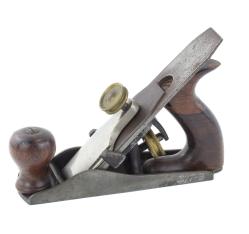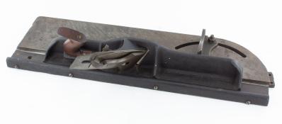 B67-492 SHOOT BOARD AND PLANE. Unmarked and somewhat resembles the Stanley No. 51/52 but with a more primitive fence with no hold-downs or pre-sets. 25"x 8" base, 2" Stanley cutter, rosewood tote has mild wear, japanning 90%, heavy. Unusual. From the collection of Harold Unruh. Good+ 400-800