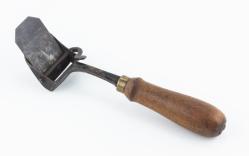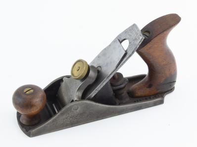 B67-497 NUMBER ONE SIZE SMOOTHING PLANE. Union Tool Co. No. X0. The same size as the Stanley No. 1 but much rarer; Union was in business from 1900 until 1920 when it was bought by Stanley. Base of tote has major crack and chipping with some possible charring (looks like someone put it too close to a radiator) but doesn't impact its use. Otherwise a nice example with original marked cutter and good knob, metal clean. From the collection of Harold Unruh. Good 1000-2000