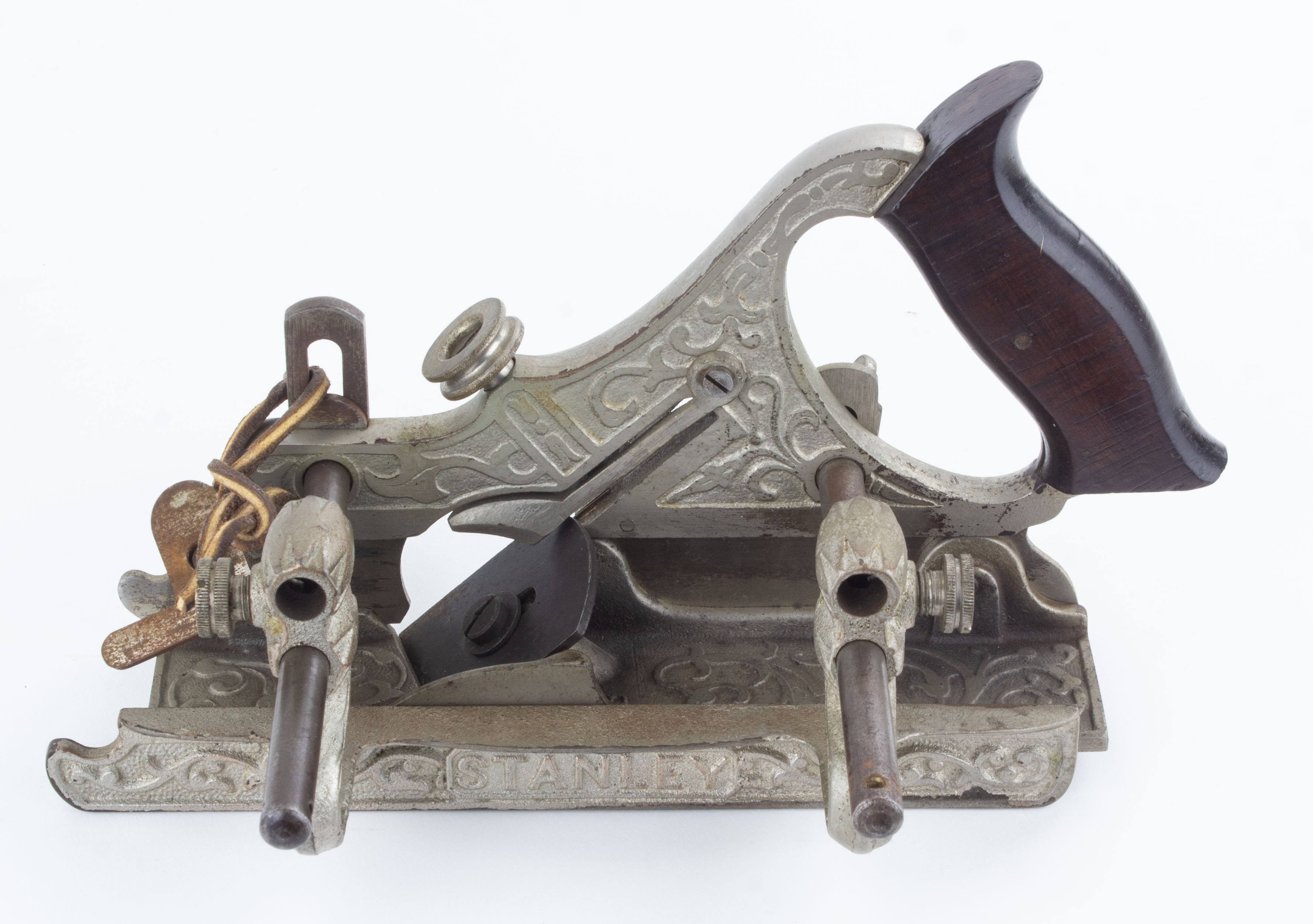B67-508 MILLER'S PATENT COMBINATION PLANE. Stanley No. 141. Includes the bullnose attachment, nickel plating 98%, tote in nice shape with no chips or scratches. Has filletster cutter only. Light surface rust on bullnose attachment and front depth stop. Good+ 250-500