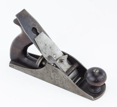 B67-511 SMOOTHING PLANE. Bailey Tool Co. Based on Joseph Bailey's 1871 patent for the cam lever cap. The plane shown in PTAMPIA I, Figure 67, with an 8-1/2" sole and 2" proper marked Battleaxe cutter. Rust and light pitting on sole and both cheeks, wood fine, traces of japanning. From the collection of Harold Unruh. Good 400-800