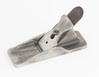 B67-512 CAST ALUMINUM BLOCK PLANE. Patent Applied For. 6" long solid aluminum body with aluminum lever cap, cast "Patent Applied For" at toe, has Sargent No. 217 cutter. Unsure of maker but nicely made. From the collection of Harold Unruh. Good+ 100-200