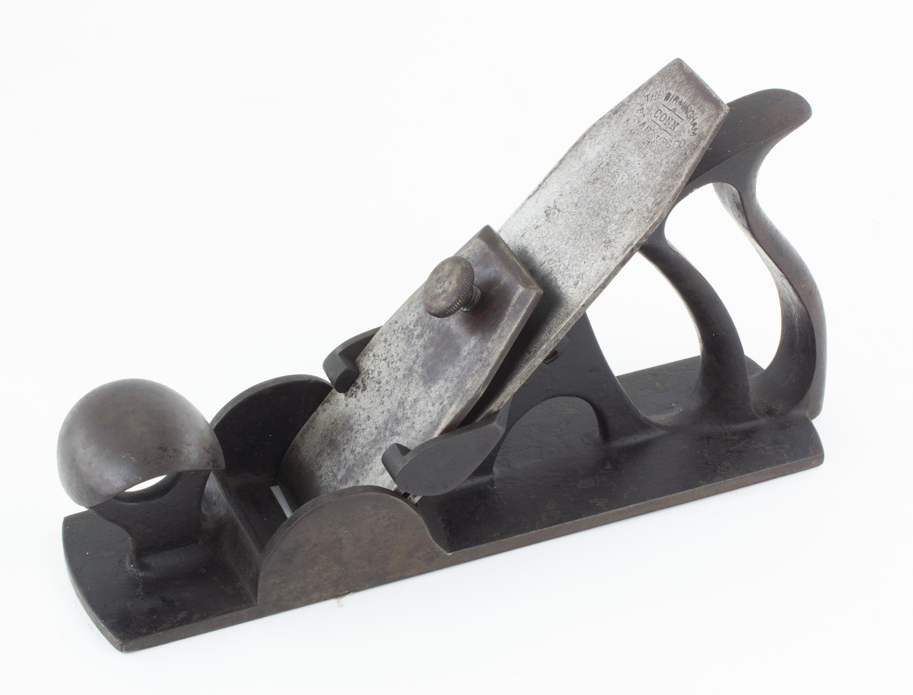B67-514 IRON BENCH PLANE. Birmingham Plane Co. 9" version of the plane based on George Mosher's patent and manufactured by Birmingham. Proper marked cutter, with the second version of the cutter clamp (see PTAMPIA I, Figure 233B), japanning 80%, body undamaged. Good+ 150-300