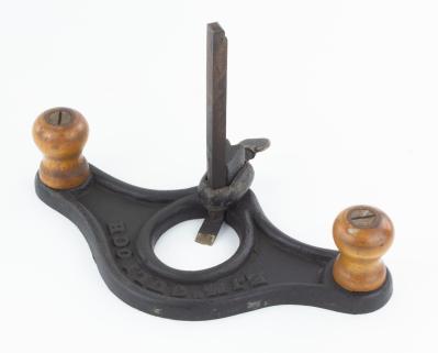 B67-516 CAST IRON ROUTER. E.J. McCulloch. 10-1/2" across, one cutter, japanning 80%, McCulloch name cast into body, the second L is worn down at the base. Wood knobs have wear but no damage. See PTAMPIA II, page 370. From the collection of Harold Unruh. Good+ 100-200