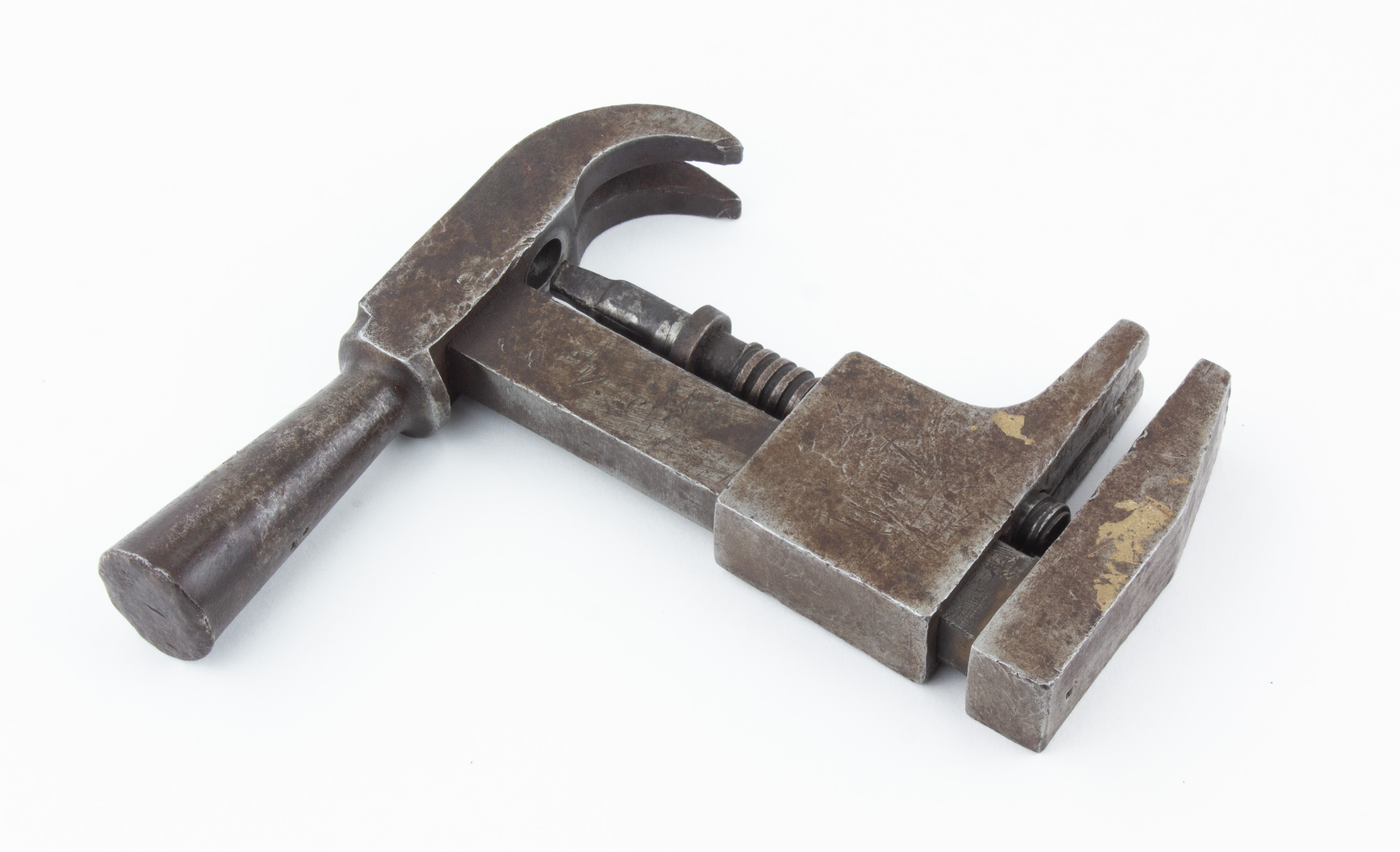 B67-524 COMBINATION WRENCH. Nut wrench with adjustable jaws, with a claw hammer on the end. The jaws only close to 1-1/4" and a part might be missing. Unsigned, kind of dinged up but works smoothly. From the collection of Jim & Christa Schoenky. Good 50-100
