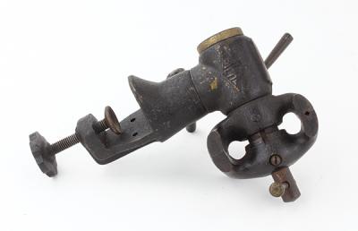 B67-527 DOUBLE JAW BENCH VISE. Biehl. 1-1/2" and 2-1/2" sized jaws rotate so either one can be on top. Has built-in bench clamp that allows angle to be adjusted. Has "Biehl" cast inside a diamond. 9" long total, japanning 80%, works smoothly. Good 60-120
