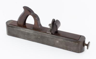 B67-532 RULEMAKER'S PLANE. Larger than most; 16" heavy cast iron body with what looks like rosewood fill, and a vertically bedded 1-3/8" cutter with a depth setting mechanism activated by a large adjusting knob on the toe. Rulemaker planes used a vertical scraping iron to provide a fine uniform finish for boxwood or ivory. Well made and unusual. From the collection of Harold Unruh. Good+ 300-600