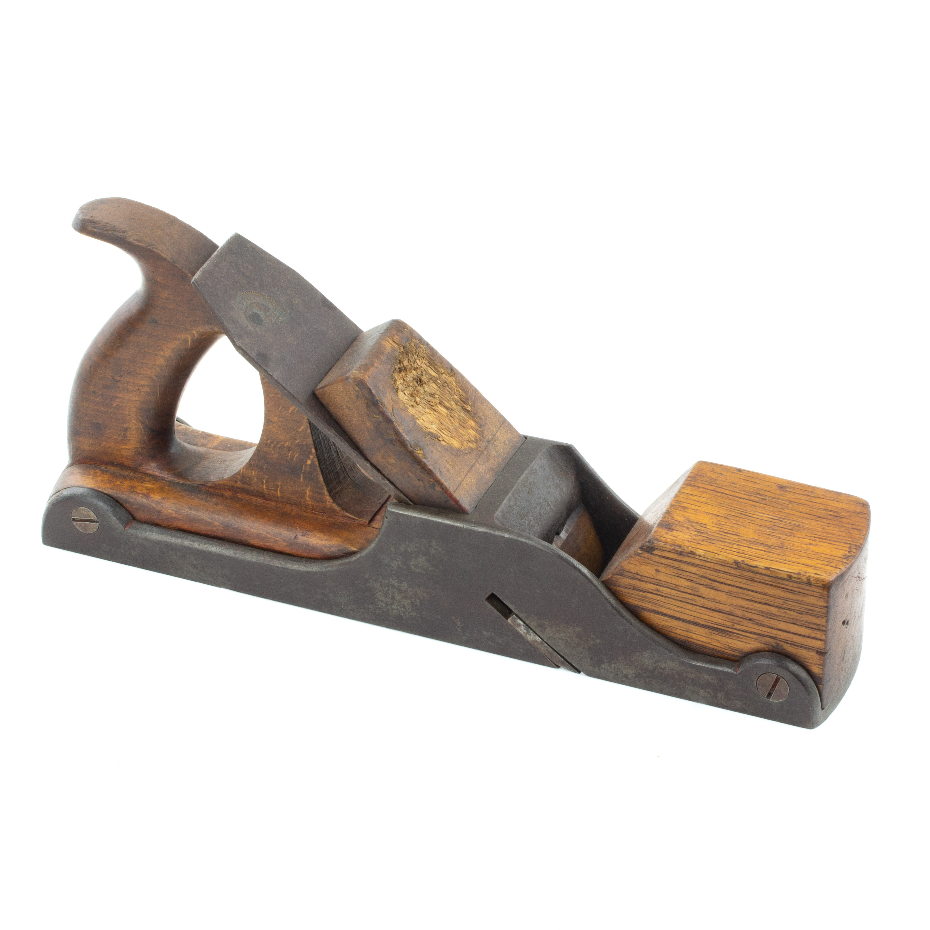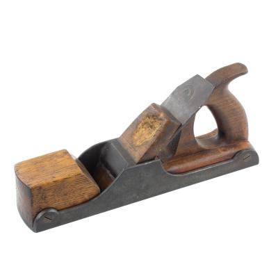 B67-534 KNOWLES TYPE RABBET OR BADGER PLANE. Cast iron Knowles-type body and 12-1/2" sole. The mouth opens into the right cheek, and the 2-1/2" Buck Bros. cutter has been altered so the right side fits the mouth. The closed tote and front bun are held in place with wood screws through holes cast in the cheeks. Looks manufactured, but completely unmarked. A large gouge out of the center of the wedge, wood and metal otherwise very clean. A highly intriguing plane. From the collection of Harold Unruh. Good+ 1000-2000