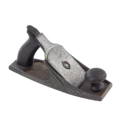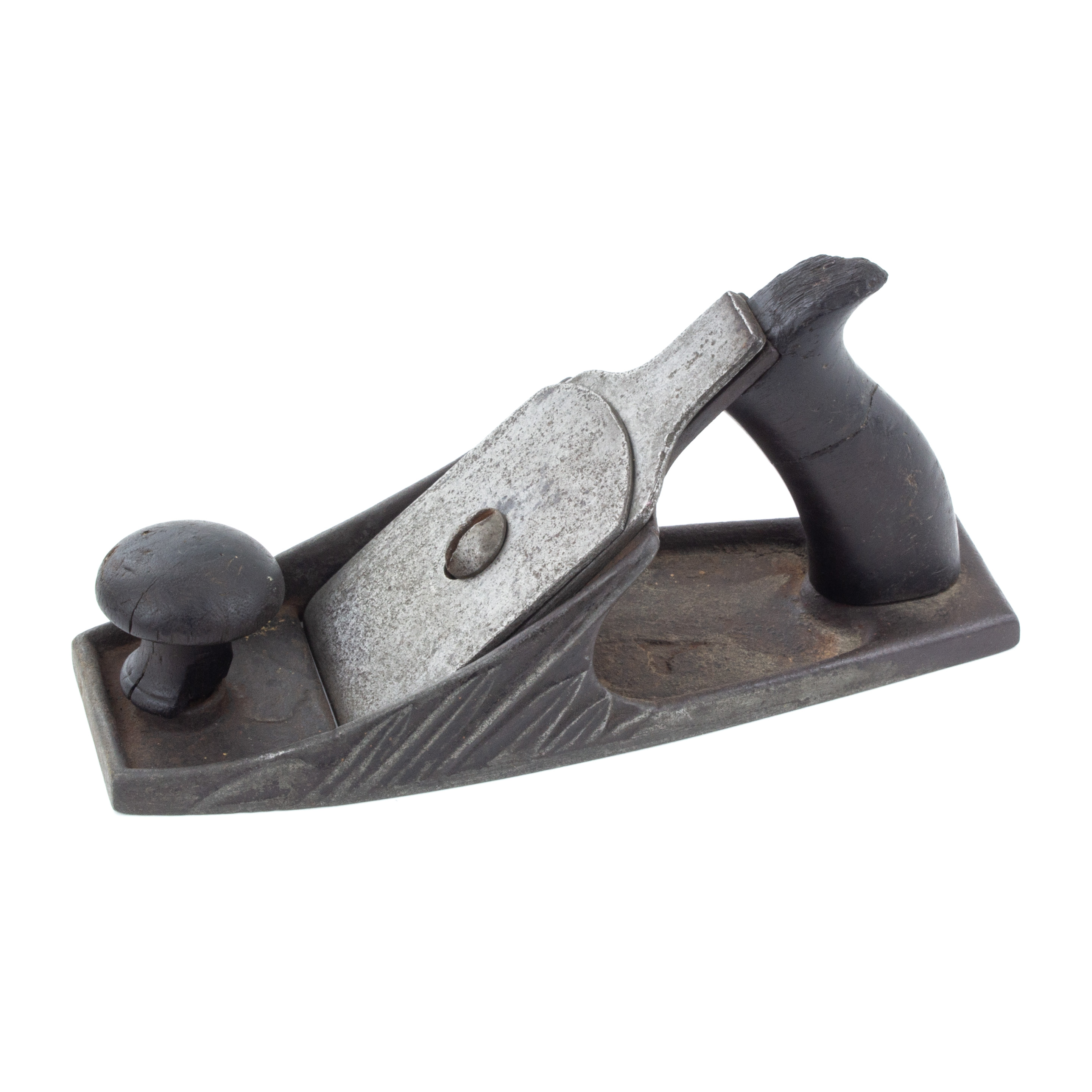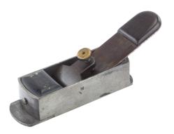 B67-535 SMOOTHING PLANE. Made by the same unknown manufacturer as the plane shown in Figure 151 of PTAMPIA II, with 8-1/2" sole and 2-1/2" unmarked cutter. Base of knob broken and the tote has a reglued split and big chip from the end. Surface oxidation. From the collection of Harold Unruh. Good 200-400