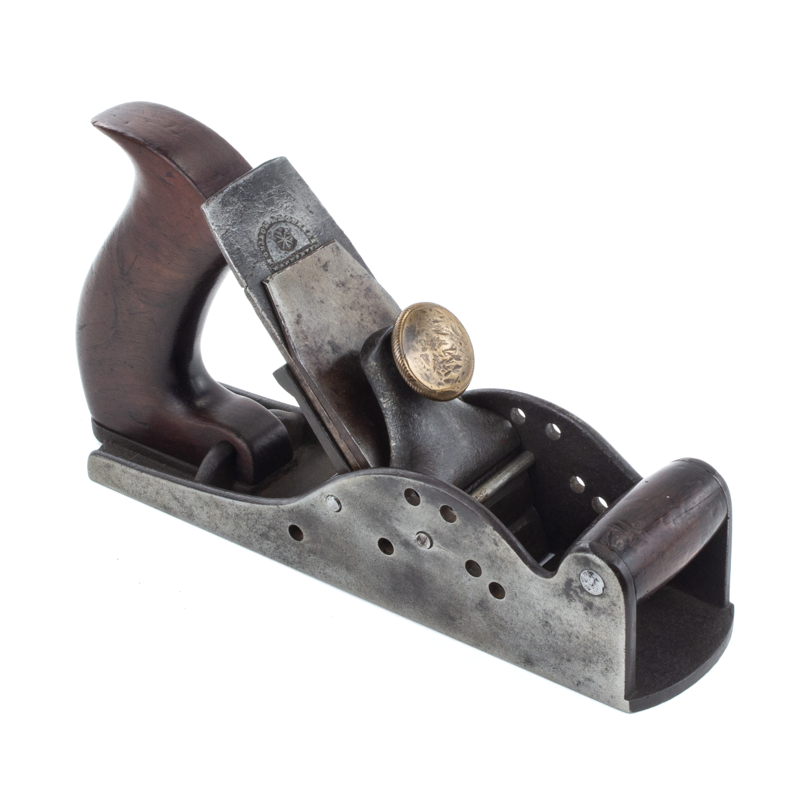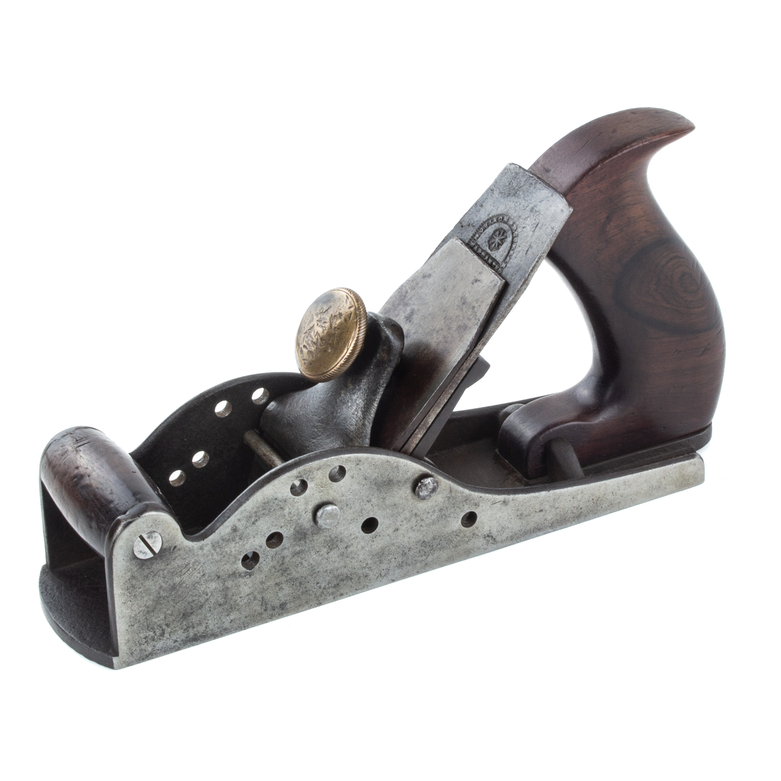 B67-544 ADJUSTABLE PITCH SMOOTHING PLANE. First Leonard Bailey Patent. Bailey's first patent, granted 8/7/55, was for a "rocking frog" that allowed the cutter to be positioned at different angles, and was used as the basis for the No. 12 series scrapers. However, Bailey also experimented with a bench plane with pins that could be inserted through holes in the cheeks to position the cutter. A handful of previous examples have surfaced, some with a brass lever cap stamped with the patent date and a later version with an unmarked cast iron lever cap. See Van Pernis & Wells, page 7. This is the latter type, with an 8-1/2" sole stamped with a "3" assembly number near the heel and a 1-3/4" Moulson Bros. cutter. The rosewood tote has a slightly different shape than the example shown in Van Pernis & Wells, and is so clean we are suspicious that it may be a well made replacement, but the rest of the plane is correct and complete and in near immaculate condition, noting some dinging on the lever cap and a small crack in the cutter. A superb example of the earliest design of America's greatest planemaking genius; it will be a long time before you find another. From the collection of Harold Unruh. Good+ 6000-12000