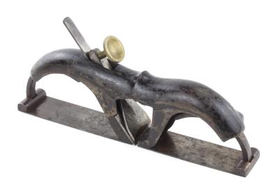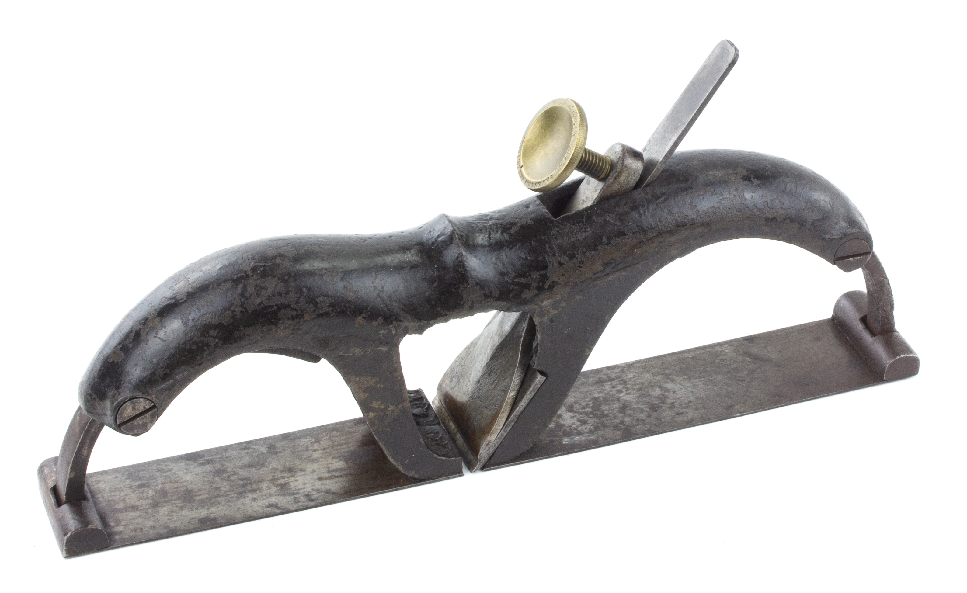 B67-545 FLEXIBLE SOLE PLANE. Type 1 Evans Patent. The earliest patented flexible sole plane, invented by George Evans of Norway, Maine, in 1862. The more common - but still rare - version is often mistaken for the Stanley No. 13 but was manufactured by R.H. Mitchell of Hudson, NY. The original version, manufactured by Evans himself, is as rare as hen's teeth, with only a handful of examples known. It has shield-shaped openings on the cheeks, exposing the full width of the cutter to allow it to cut rabbets, as described in the patent. Japanning 50%, some minor surface oxidation but no pitting, marked with Evans' original 1862 patent date on the brass knob (the one other example we've seen was marked with Evans' 1864 patent). From the collection of Harold Unruh. Good+ 4000-8000