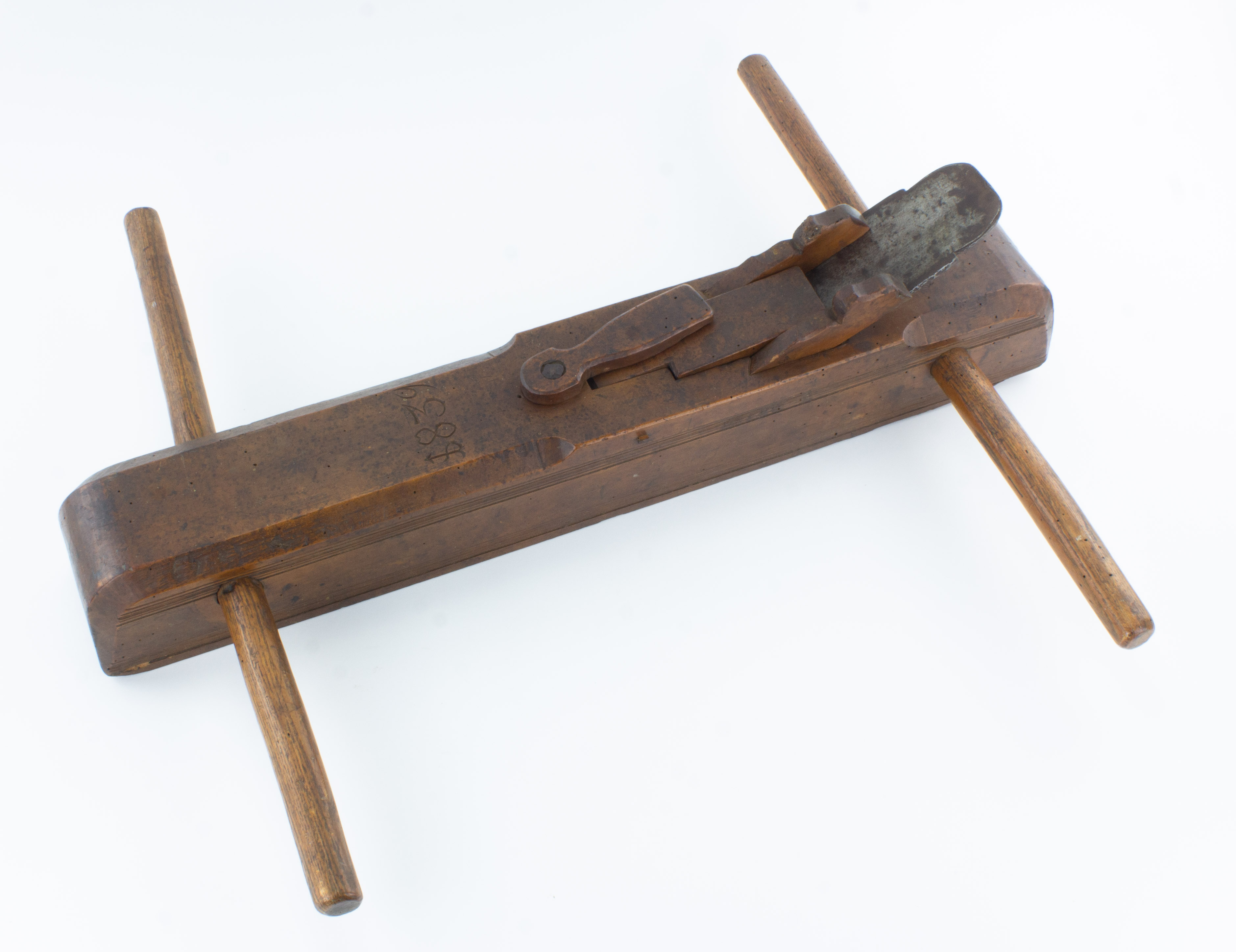 B67-551 SPELK PLANE. Dated 1839. 26" long with two handles, 2-3/4" cutter with unusual pivoting locking lever cap mechanism, 1839 carved into top of body. Some damage to fences on sole at toe, overall age wear. Good 125-250