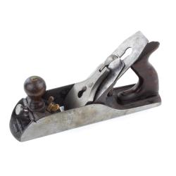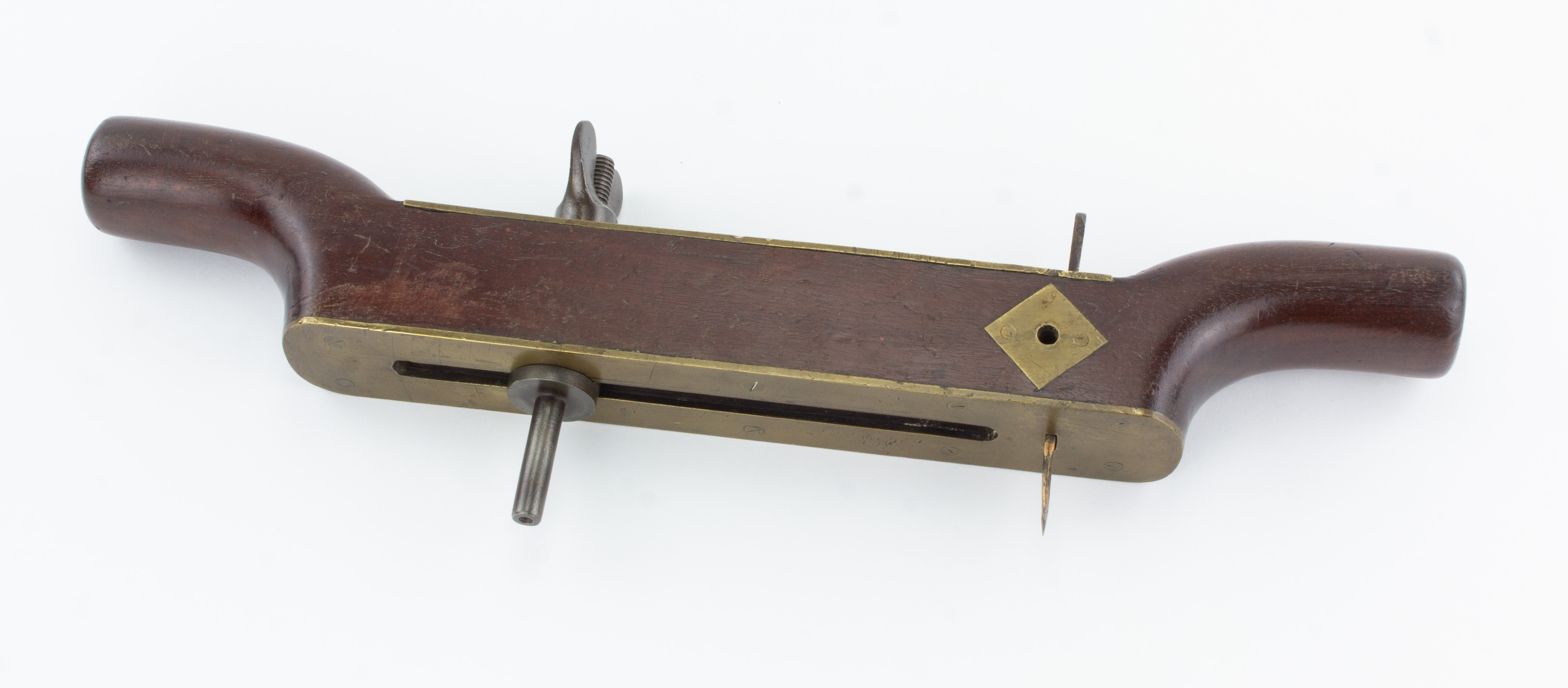 B67-555 LEATHER CIRCLE CUTTER. 17" wide red mahogany body with brass top and bottom plates, has a sliding center pivot locked by large wingnut, slitter cutter at one end that is missing the locking mechanism. Brass diamond inlays on both sides. Unusual and well made. From the collection of David Jeffers. Good 100-200