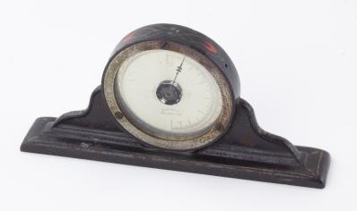 B67-562 INCLINOMETER. E. Duffy. Extremely rare example of the level patented in 1887 by Edward Duffy of Pawtucket, RI. 7" cast iron base with 2-3/8" diameter silver dial with delicate pointer and very detailed fine divisions. Marked "Pat. Apld For." Japanning 90% with red and gold pinstriping on the top, some corrosion around the dial. Needle appears to be stuck. Good 1500-3000