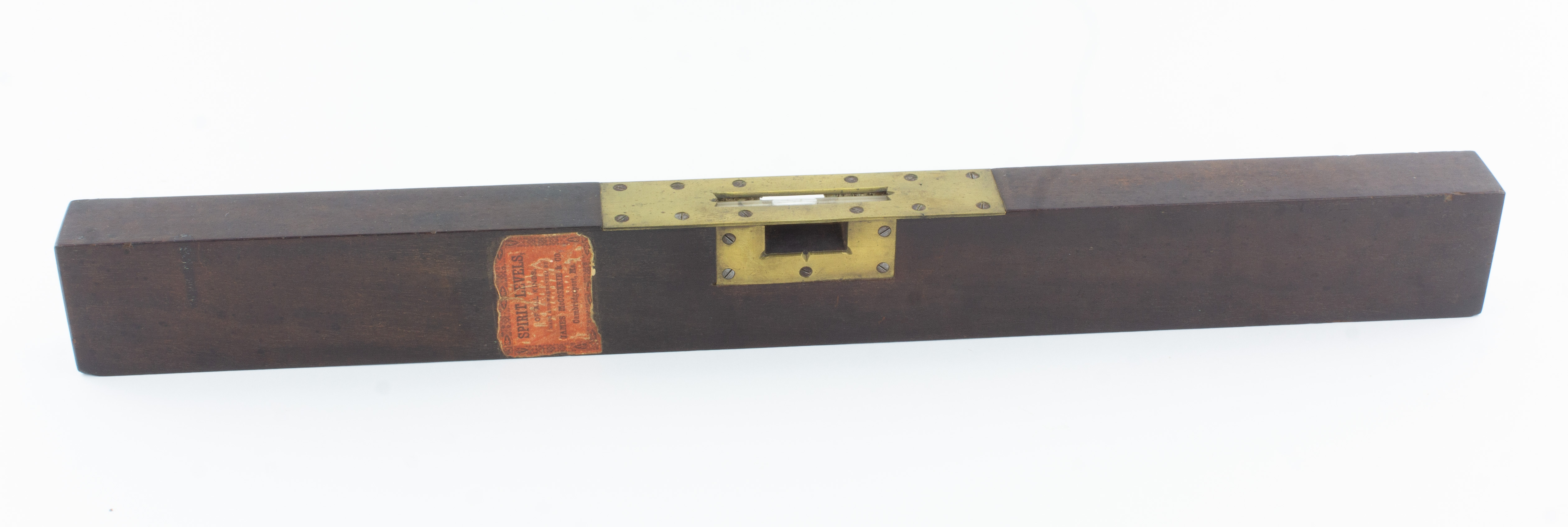 B67-564 WOODEN LEVEL. James McCoskrie & Co. Mahogany, 24", single level vial, no plumb. Original paper label is 95% intact and fully legible. McCoskrie was an early maker who worked in Cambridge in the 1840s, this is a good example of his work with the distinctive square side sights with filed corners. The wooden stock is like new with crisp corners and no damage, vial is original and intact. Fine 150-300
