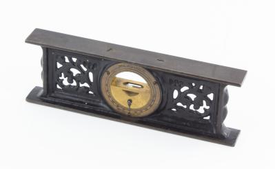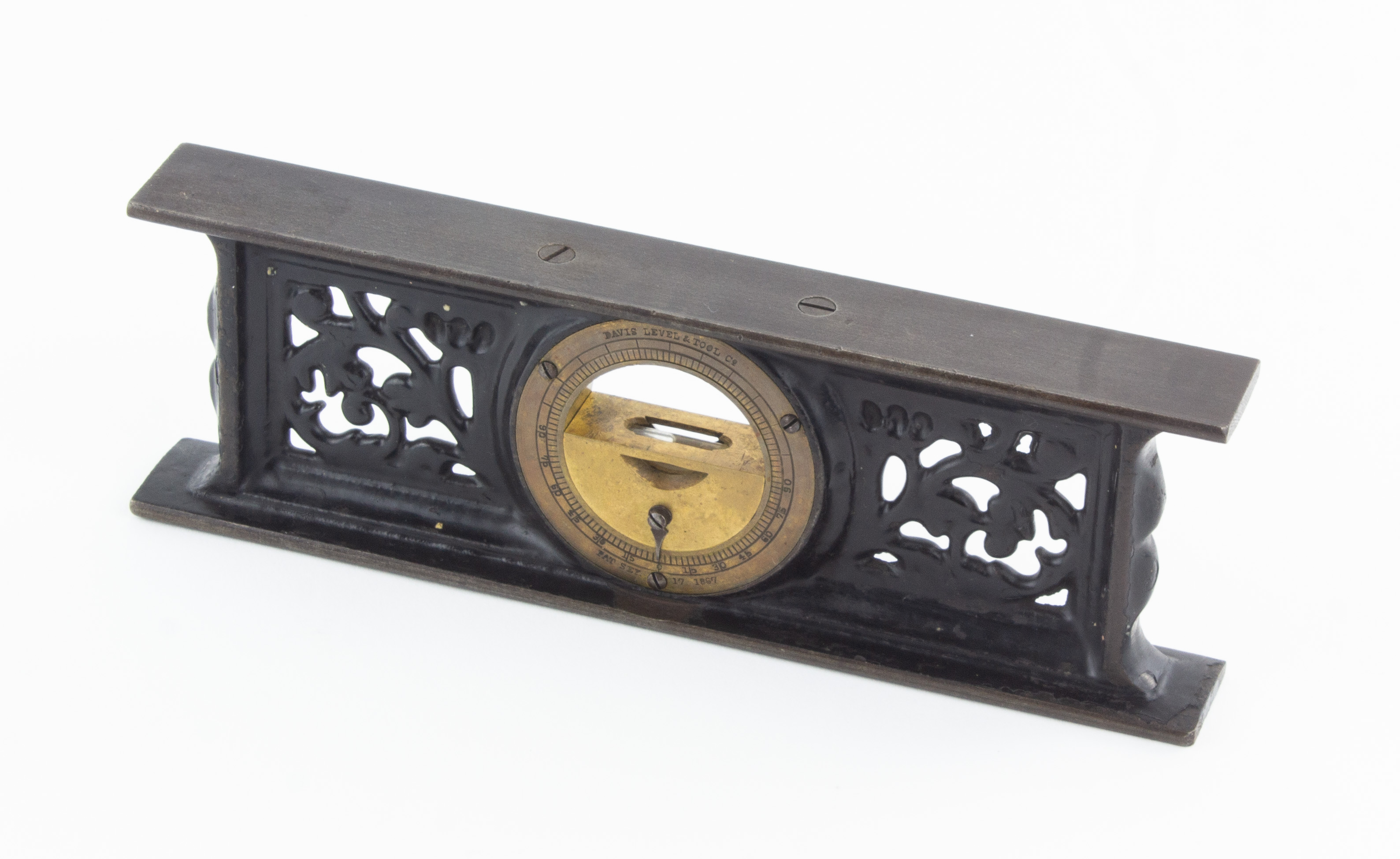 B67-566 INCLINOMETER. Davis Level & Tool No. 1. The 7" version of Davis' filigreed inclinometer, which was not added to the line until around 1890 and never had gold pinstriping. This is a good clean example, with vial compartment slightly tarnished but intact with original pointer, casting marks on the rails and no breaks, and japanning 100%. Fine 300-600