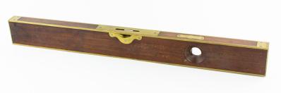 B67-569 LEVEL WITH POP-UP SIGHTS. Wood Patent. The spring loaded sights on the ends of the level that pop up at the push of a button were patented in 1887 by Oscar Wood of Passaic, NJ. He manufactured some himself, but most were made by H. Chapin and sold through Shapleigh Hardware and Tower & Lyon. This one is a 28" brass-bound, solid mahogany example marked Tower & Lyon No. 15, and also marked with Wood's patent information. Wood and metal are both very clean, and, unlike many examples, the sights still work smoothly. From the collection of David Jeffers. Fine 120-240