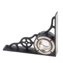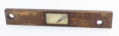 B67-570 GRAVITY INCLINOMETER . Loeschner Patent Protractor Level. Patented in 1921 by Henry Loeschner of Fredericktown, MO, and features a central compartment that can be popped out of the stock and used separately as a gravity inclinometer. In the first version, in addition to the hanging indicator, the central compartment included four level vials glued to the edges that in many examples have become loose or broken; in this example three are present and intact but one has come loose. The label is intact and original but has some staining, possibly caused when the fourth vial broke. 24" long, wood is worn but undamaged, scaled brass ruler on the top rail is tarnished. A decent example of a rare inclinometer. Good 300-600