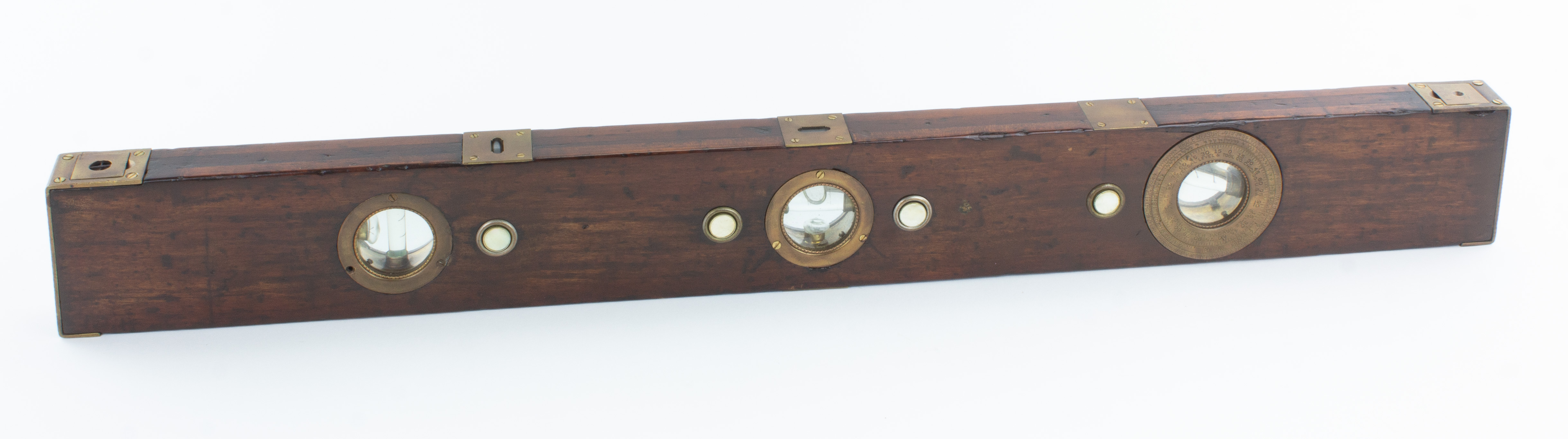 B67-571 ELECTRIC LIGHTED LEVEL. Federal Level Co. Universal Level Co. of Chicago (which later became Federal Level) produced a whole series of lighted levels in the beginning of the twentieth century based on Daniel Frank's 1912 patent. This is the deluxe version, with 30" laminated rosewood stock, four separate bulbs, one in each porthole and one in the transverse mounted top vial. Complete with all bulbs, vials and magnifying porthole covers, and pop-up sights. One screw is missing from a vial surround, and the stock has some miscellaneous scratches and dings and slightly rounded edges, but overall one of the nicest examples we've seen. Good+ 300-600