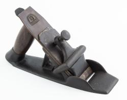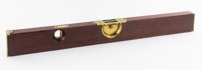 B67-575 INCLINOMETER. Nilson Patent. Patented in 1900 by Magnus Nilson of Oakland, CA, this level features two side-by-side level vials, one of which is mounted on a rotating brass plate. The patent shows the vials being independently rotated, and the plumb vial also being adjustable, but in every one of the very few known examples the second vial and the plumb vial are fixed. It also features a sighting tube through the stock. 28" long, good vials, brass tipped, mahogany stock has some dings including a 1-1/2" dent but no real damage. Good clean example of a very rare patented inclinometer. From the collection of Jim Gehring. Good+ 300-600