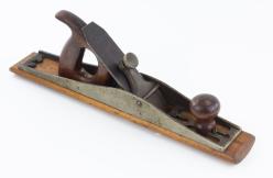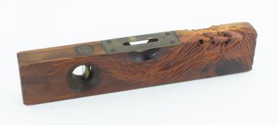 B67-576 DECORATIVE CARVED LEVEL. Stanley No. 104. 12" with vee mark. The level itself is nothing special, but the stock has a very well done and elaborate carving of a wood gnome, or possibly just an old man with flowing beard, which turns it into a piece of folk art. Good+ 100-200