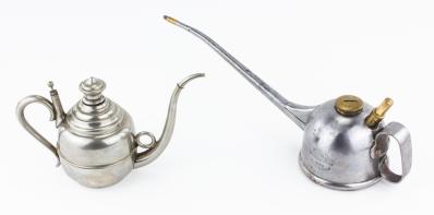 B67-583 LOT OF TWO OIL LAMP FILLERS. One unsigned, plated brass, with graceful decorative shape, 8" across, very clean, possibly missing cap on the end of the spout, thumb activated pump. The other is plated iron, with a long spout threaded on the end for a missing cap, riveted handle, with "Jos. Lucas Ltd., Forced Feed No. 62, Birmingham" engraved inside, a few dents and tiny spots of corrosion, thumb activated pump. Good & better 150-300