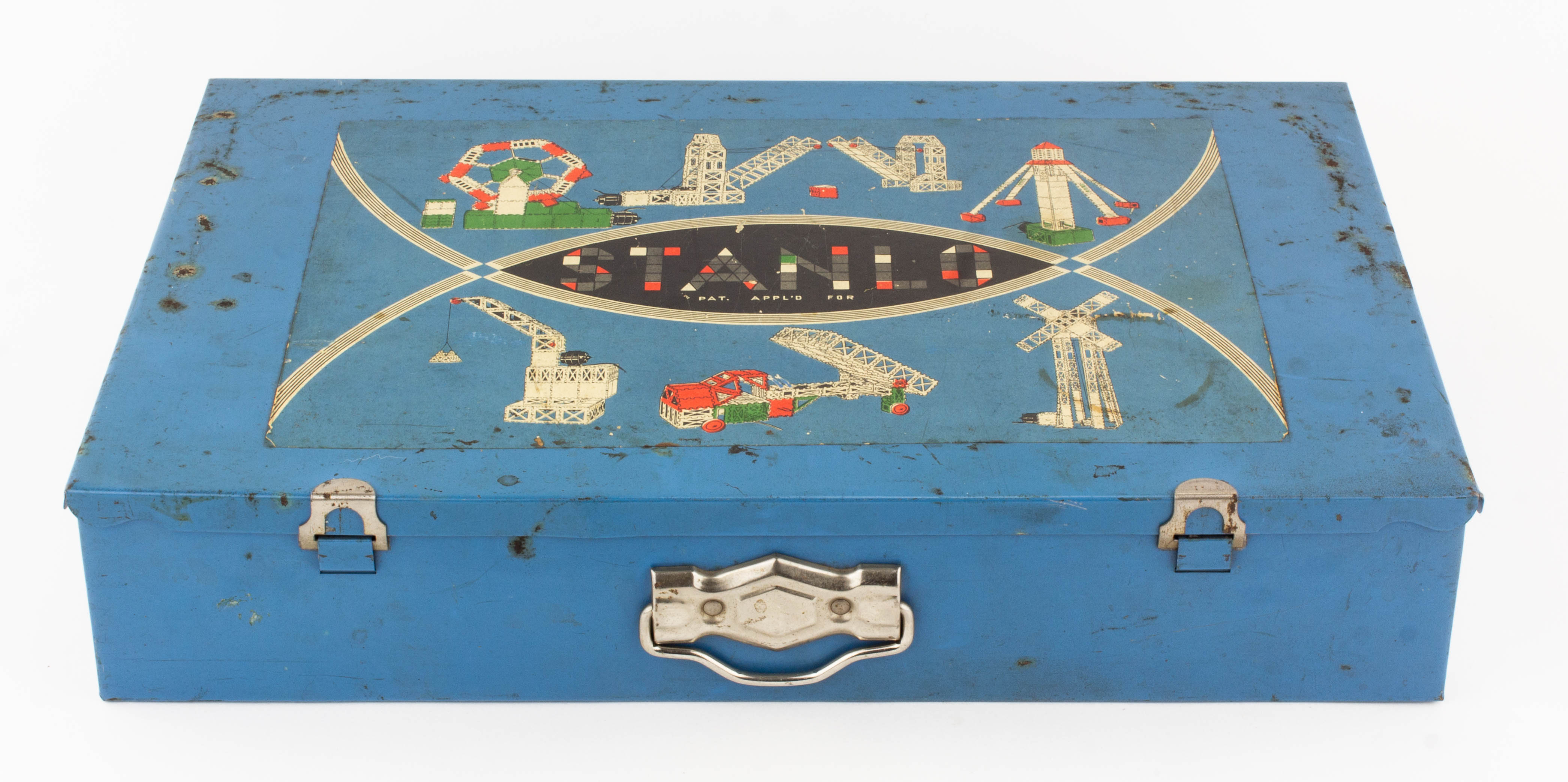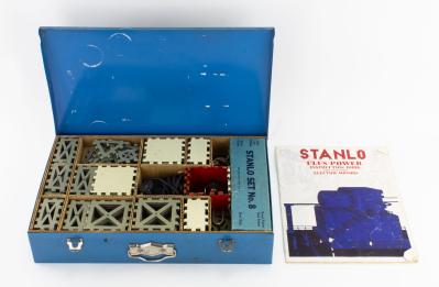 B67-588 BUILDING TOY. Stanlo No. 8. Unusually clean and complete example of Stanley's answer to the Erector Set. 16-1/2" by 10-1/4" steel box with paint mostly complete and almost no rust; the parts are all neatly stacked in their divided compartments, includes electric motor, instruction booklet, and tools in their original cardboard box. A very clean example. Good+ 100-200