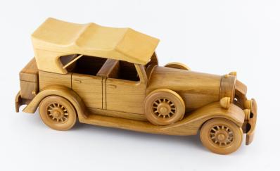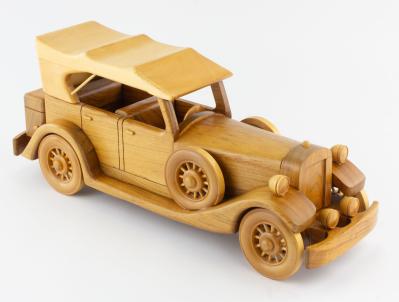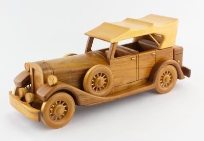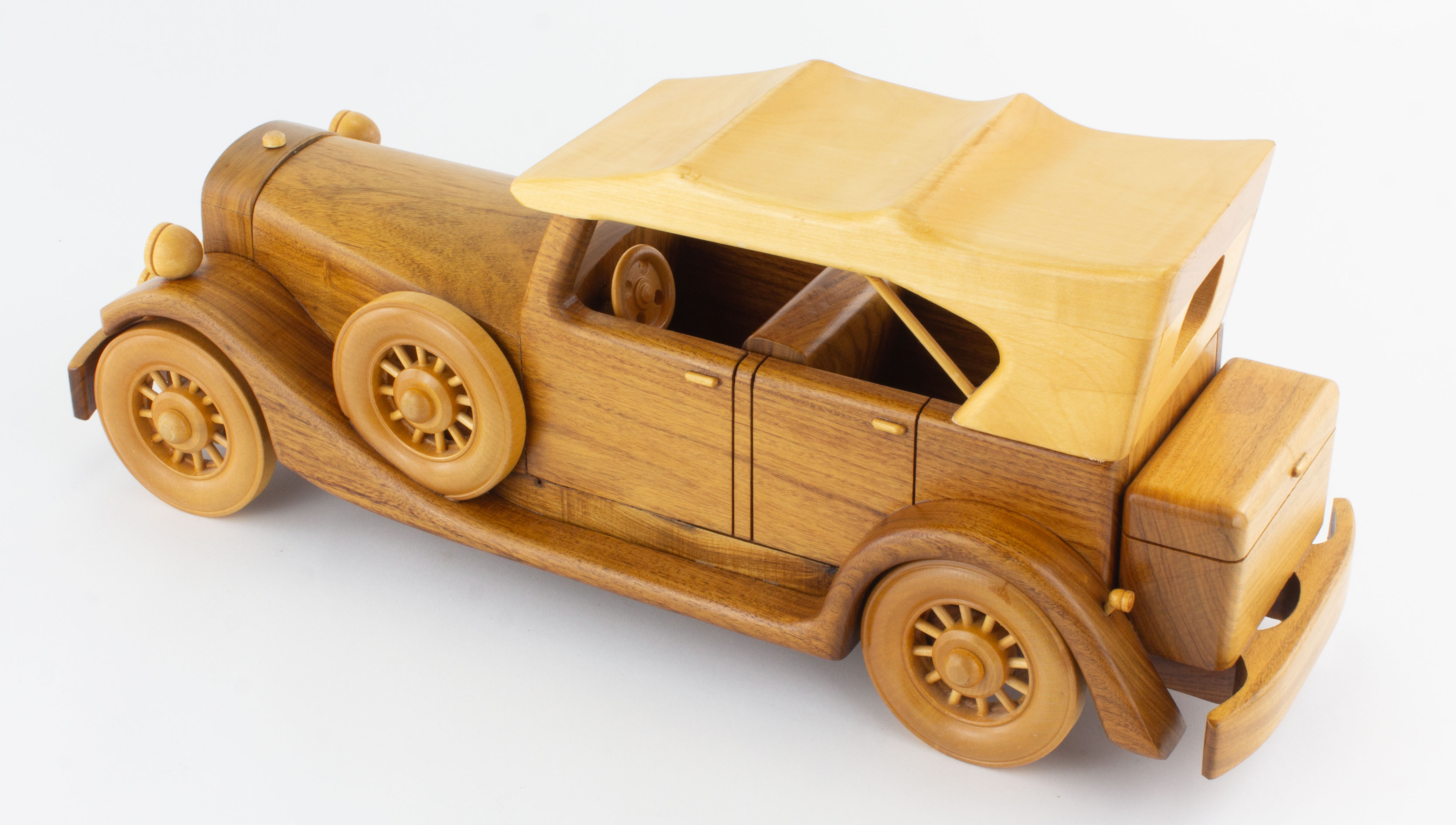 B67-590 HANDMADE WOODEN MODEL CAR. Bill Chase. Model of a 1930 Packard touring car, 19" long, Bolivian rosewood and aspen. Signed and stamped on the bottom by artist Bill Chase. In immaculate condition. Fine 200-400