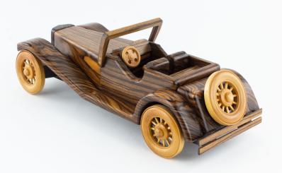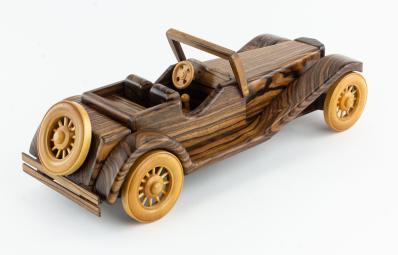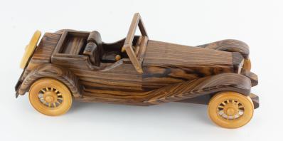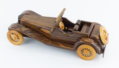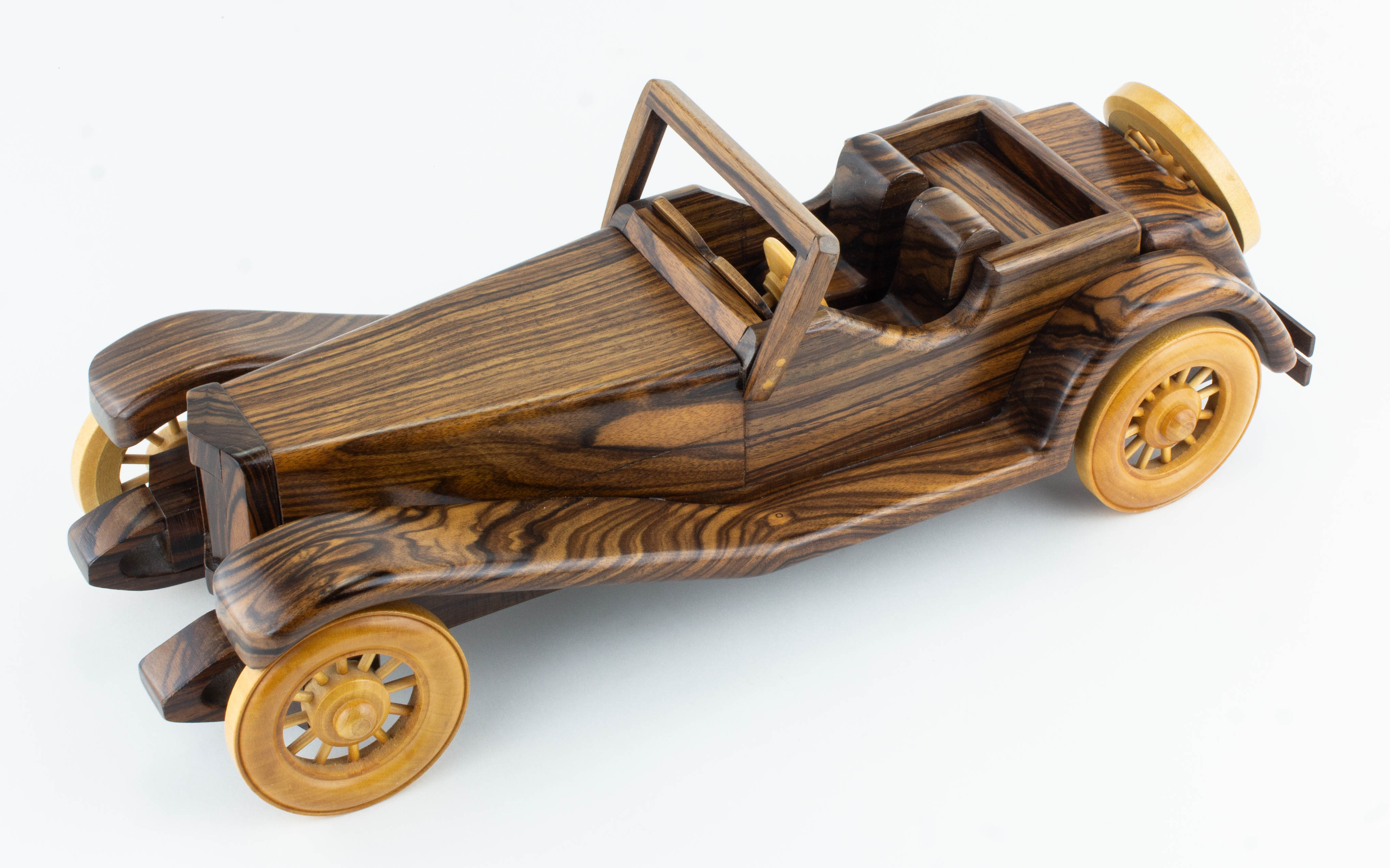 B67-591 HANDMADE WOODEN MODEL CAR. Bill Chase. 1939 Jaguar SS100. 18" long. Striped African ebony and aspen. Signed and stamped on the bottom by artist Bill Chase. In immaculate condition. Fine 200-400