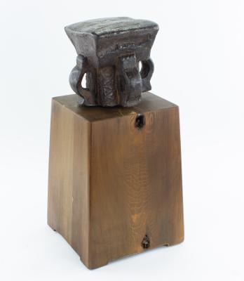 B67-593 EUROPEAN ANVIL. 7" x 6" working surface with decoratively shaped base, mounted on 8" x 8" x 12" wooden stand, 19" tall total. Well used but plenty of life left and nicely made. Good 200-400