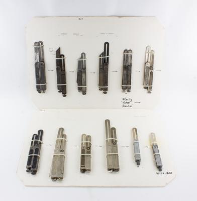 B67-594 LOT OF TWO BEVEL DISPLAY BOARDS. Stanley. Two foam boards, with 22 bevels total mounted on it, beginning with 1908 patent up through the aluminum No. 46-800. Most nice and clean, a few patches of oxidation on some. A nice display of the evolution of the Stanley bevel. From the collection of Steve Dice. Good+ 200-400
