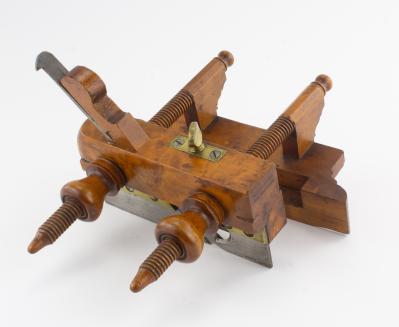 B67-608 UNHANDLED SCREW ARM PLOW PLANE. D.R. Barton. Body is an attractive burl wood, possible maple, boxwood arms, nuts and wedge. C mark, Tillotson No. 3 cutter. A few tiny chips from the nuts and threads but overall in near fine condition. Although Barton was a prolific toolmaker and dealer, plows by him are not common and this one is very nice. Good+ 120-240