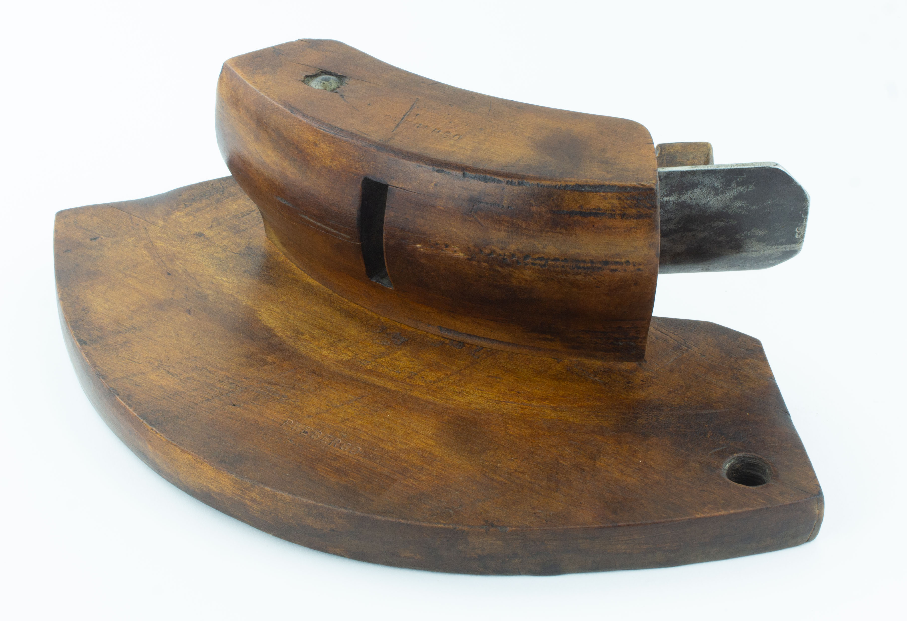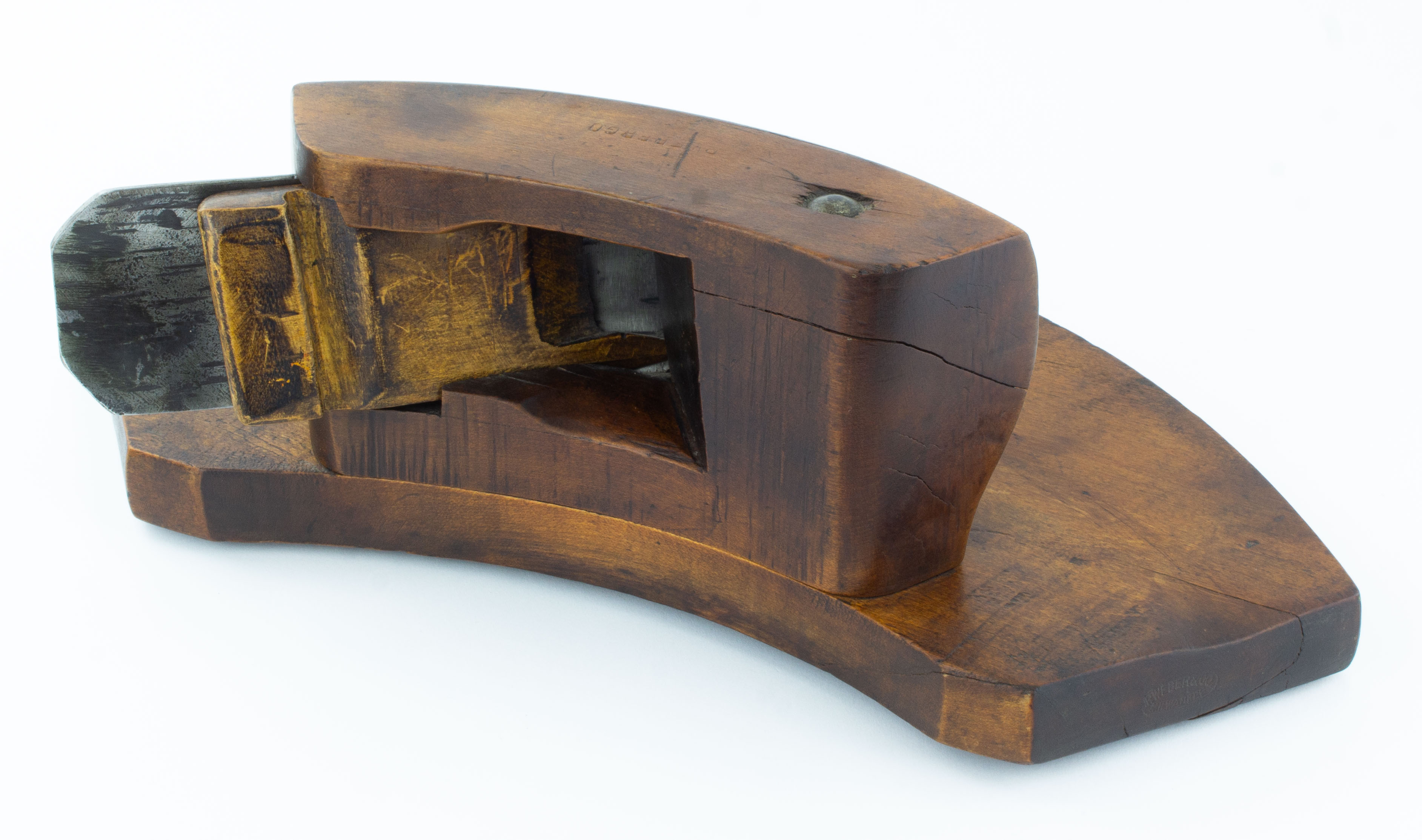 B67-611 COOPER'S HOWELL. Used to cut the hollowed out area into which the cask head is fitted. 16" across, cuts a 2-1/2" howell. There's an old split that has been repaired with an old bolt and a hang hole; the name "Pwebergo" is stamped in three places. From the John Lervoog collection of cooper's tools. Good+ 50-100