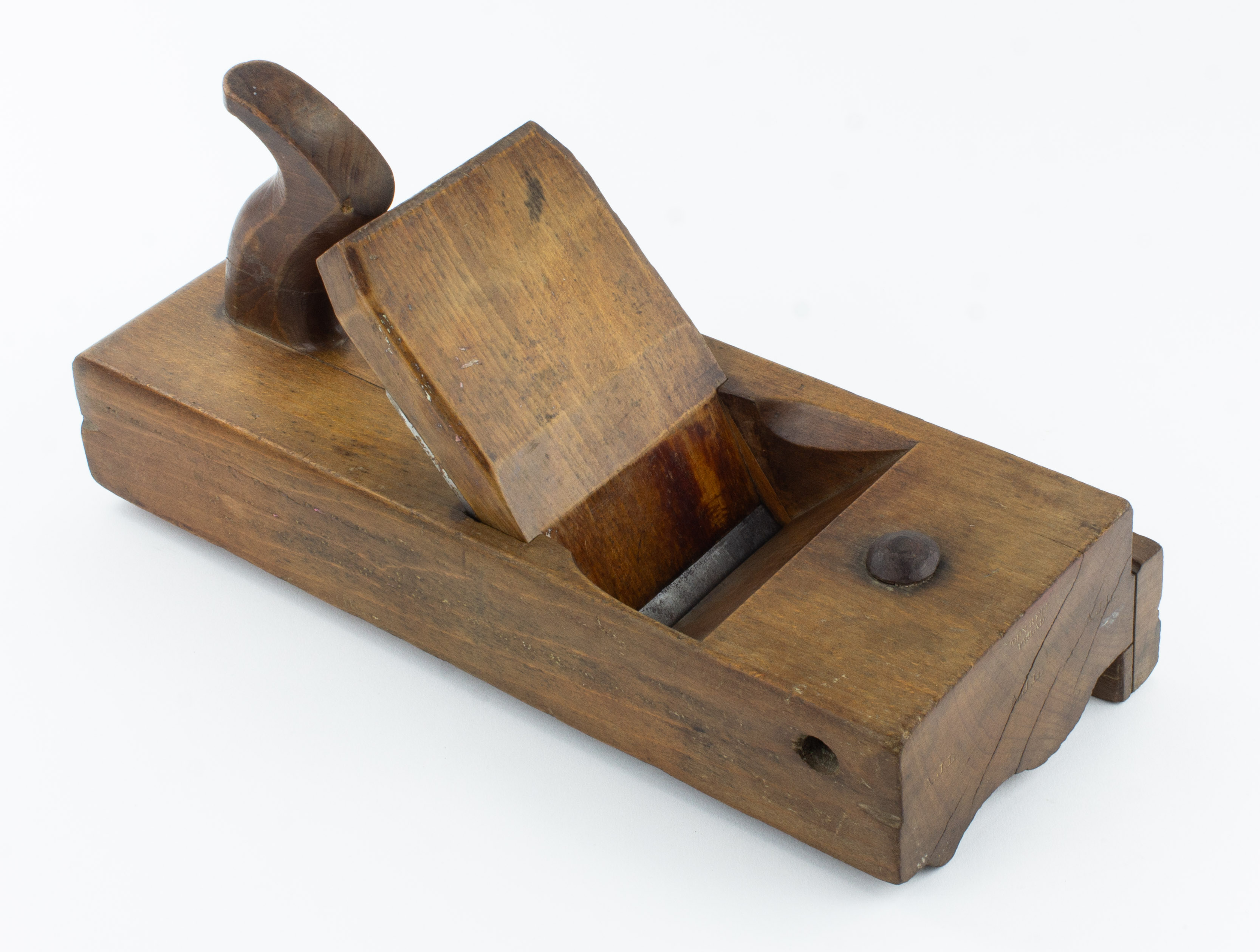 B67-616 CORNICE PLANE. John Bell. Quirk ogee profile, 4" L & IJ White cutter, 14" sole, open tote, attached fence, apprentice hole, iron strike button. C mark. Light overall wear including age checks at toe and heel. Good+ 120-240