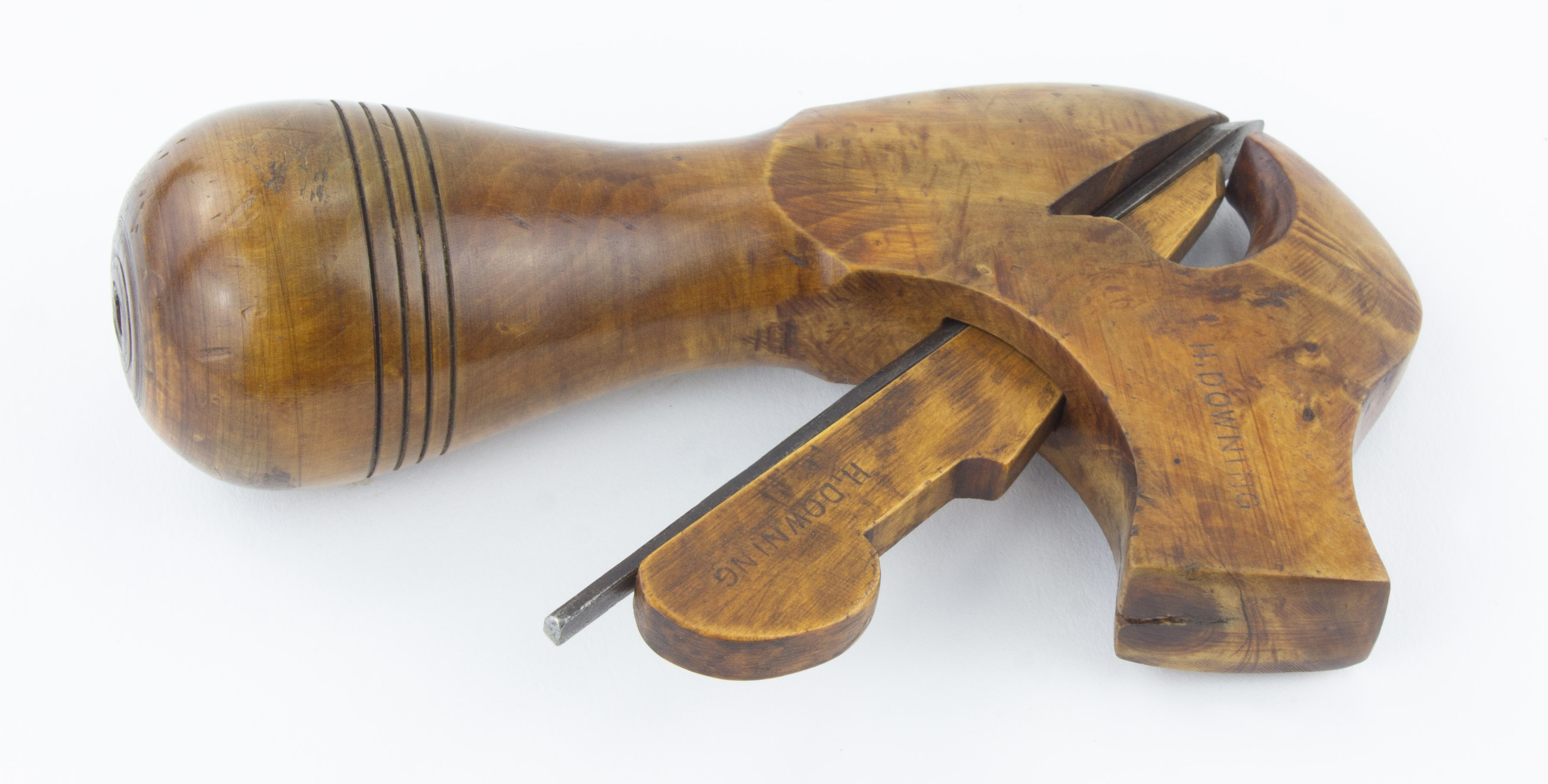 B67-620 COACHMAKER'S REEDING PLANE. Boxwood, decorative shape, with a deeply compassed convex sole. 6" long overall. Marked by user (and probably maker). Beautifully made; wood fine. From the collection of Steve Dice. Fine 100-200
