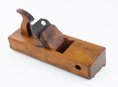 B67-622 CROWN MOLDER. T. Dodgson. 3-1/4" profile with integral fence, 14-1/2" sole, center mounted open tote, apprentice hole, wide flat chamfers. A couple of age checks and some small gouges near heel, but wood otherwise very clean. There's a square hole in the cutter. The name "T. Dodgson" stamp looks like a maker, but isn't in AWP or Goodman.