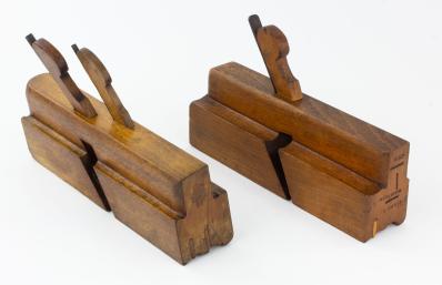 B67-624 LOT OF TWO COMPLEX MOLDERS. A double cutter quirk ogee, bead and cove by Joseph Gleave, 1-3/8" profile, spring marked, double boxed, some very mild wear to the sole but otherwise like new. The other is a quirk ogee and bead, spring marked, single boxed but with some nail holes where a strip may have been attached to the fence. There are several names on the toe, some of them obscured and illegible, none are in AWP or Goodman but it looks English to us. Wood is near fine. Good+ 60-120