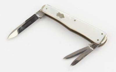 B67-633 MOTHER OF PEARL HANDLED POCKET KNIFE. Winchester. 3" handle with three blades, very clean. Winchester engraved on two blades, faint but legible, and metal shield inlaid into handle. One tight crack in mother of pearl near joint. Good+ 125-250