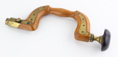 B67-640 SHEFFIELD PLATED BRACE. Buck & Co. Boxwood body with ebony head. Lever-operated chuck stamped "Buck & Co." with no address. Wood and brass have typical light scratching but no damage. Buck was a major planemaker and dealer but signed braces by him are very uncommon. Good+ 60-120