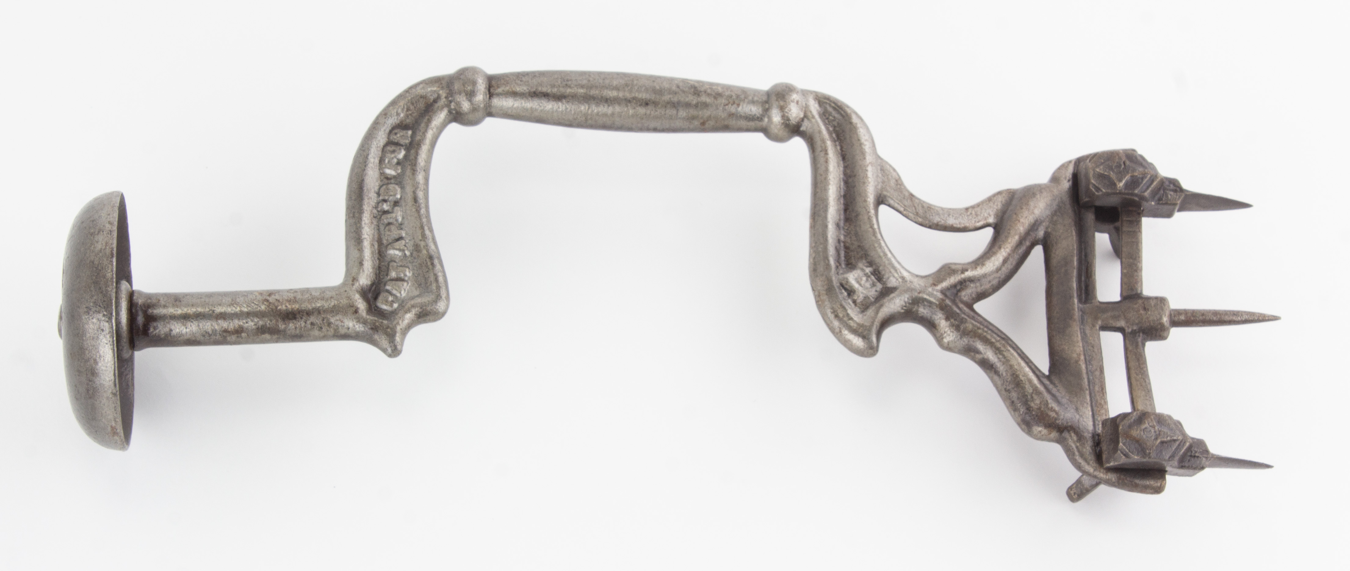 B67-642 WASHER CUTTER. Palmer Patent. Patented by Alfred Palmer of Carlton, NY, in 1878; one of several tools designed to cut washers out of sheets of leather in the days before rubber; most were designed to be chucked in a brace but there are a few single-purpose bitstock tools like this one. Has both of its sliding blades intact (which is unusual). Like all known examples, marked "Pat. Apl'd For" and with Masonic symbols as well as Palmer's name. Appears to have been cleaned with a brass wheel. From the collection of Jim and Christa Schoenky. Good+ 70-140