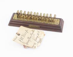 B67-644 SURGEON'S DRILL. 8-1/2" long including bit. Plated steel body with plated brass handle. The crank handle has a ball and socket joint that allow maximum flexibility in positioning and operating the drill A couple of very small dents on the handle and tiny patches of surface oxidation, but complete and works smoothly. Unsigned but believed by the consignor to be French in origin. From the collection of Steve Dice. Good+ 200-400