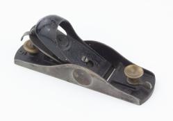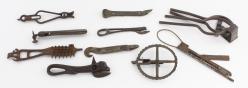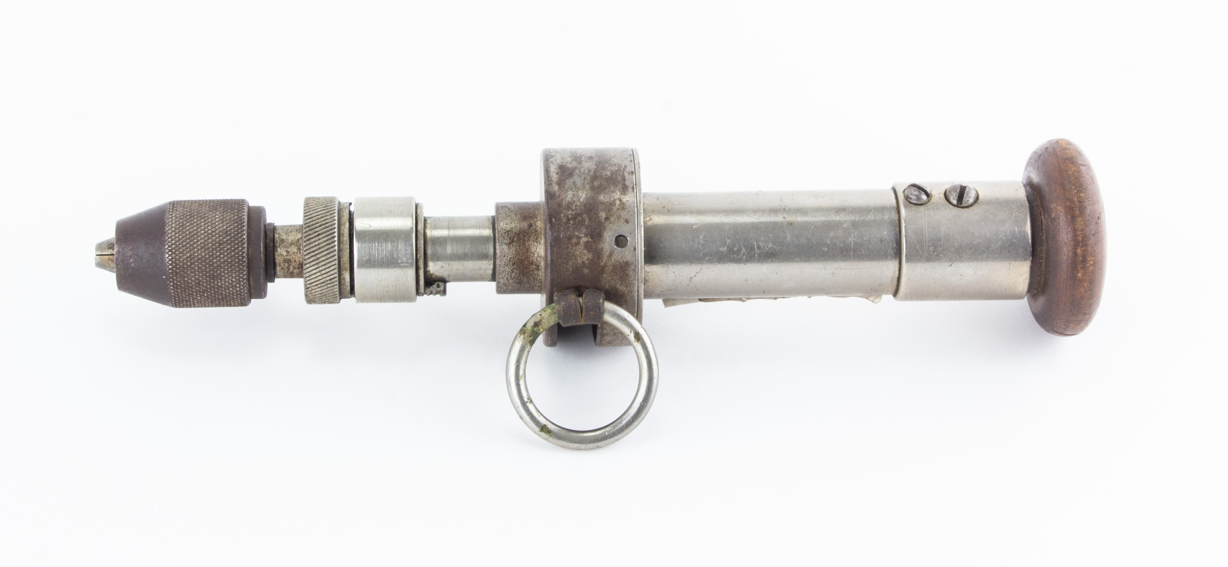 B67-645 PULL CHAIN DRILL. Uncommon variation on the bow drill in which the drilling motion is produced by pulling on a spring-powered armature that automatically returns. There are a few versions around but all are uncommon; this one is unsigned and 9-1/2" long. Steel with wooden head, original leather pull strap is intact but we wouldn't yank on it too hard. Goodell-Pratt chuck marked with Lanfair's patent. Works smoothly. From the collection of Jim and Christa Schoenky. Good+ 100-200