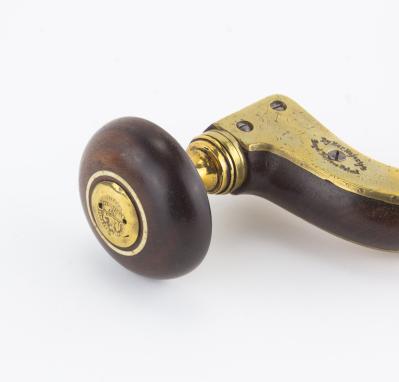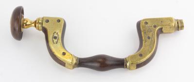 B67-646 FRAMED BRACE. William Marples Ultimatum. Very rare rosewood example, earliest stamp with number "2" under the lion and unicorn dates it to the 1850s, 67 Spring Street medallion, complete ivory ring with one break. Wood clean, moderate dinging on brass, sliding ring chuck with some damage. Excellent example of the earliest version of the Ultimatum. From the collection of David Jeffers. Good+ 600-1200